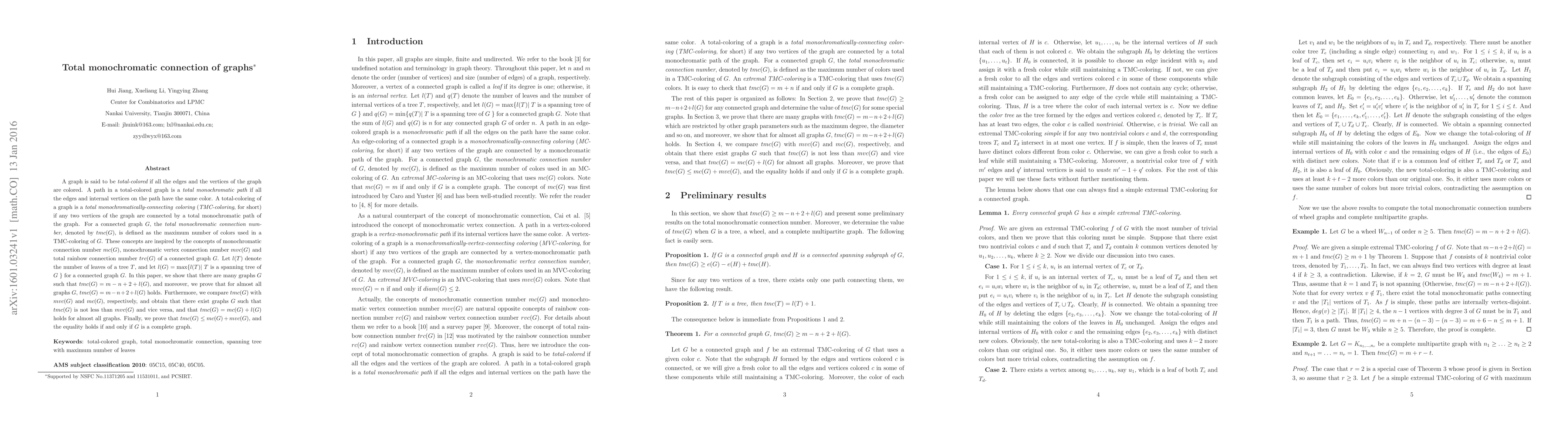 This paper explores the concept of total monochromatic connection in graphs, where all edges and vertices are colored, and any two vertices are connected by a total monochromatic path. It establishes that the total monochromatic connection number, denoted as $tmc(G)$, is often $m-n+2+l(G)$, where $l(G)$ is the maximum number of leaves in any spanning tree of $G$. The paper also compares $tmc(G)$ with other connection numbers and proves that $tmc(G)$ is equal to $mc(G)+l(G)$ for almost all graphs.