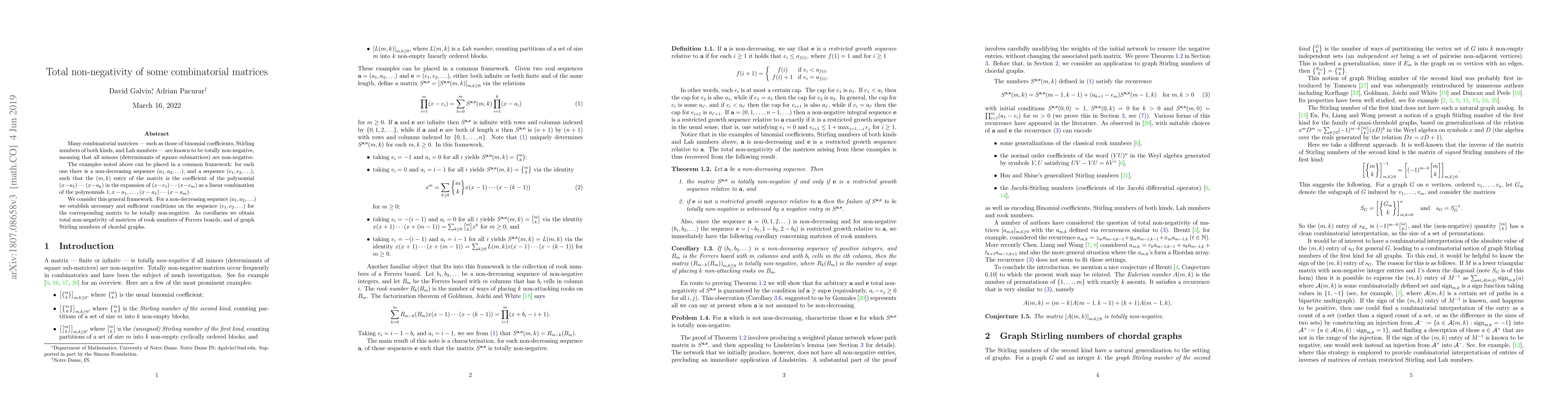 Many combinatorial matrices --- such as those of binomial coefficients, Stirling numbers of both kinds, and Lah numbers --- are known to be totally non-negative, meaning that all minors (determinants of square submatrices) are non-negative. The examples noted above can be placed in a common framework: for each one there is a non-decreasing sequence $(a_1, a_2, \ldots)$, and a sequence $(e_1, e_2, \ldots)$, such that the $(m,k)$-entry of the matrix is the coefficient of the polynomial $(x-a_1)\cdots(x-a_k)$ in the expansion of $(x-e_1)\cdots(x-e_m)$ as a linear combination of the polynomials $1, x-a_1, \ldots, (x-a_1)\cdots(x-a_m)$. We consider this general framework. For a non-decreasing sequence $(a_1, a_2, \ldots)$ we establish necessary and sufficient conditions on the sequence $(e_1, e_2, \ldots)$ for the corresponding matrix to be totally non-negative. As corollaries we obtain totally non-negativity of matrices of rook numbers of Ferrers boards, and of graph Stirling numbers of chordal graphs.