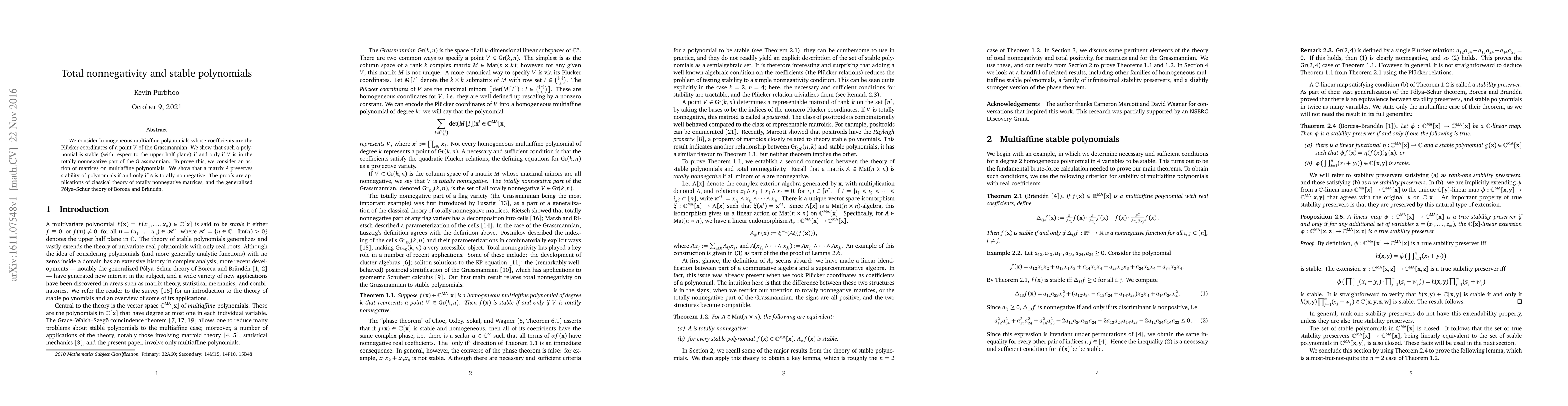 We consider homogeneous multiaffine polynomials whose coefficients are the Pl\"ucker coordinates of a point $V$ of the Grassmannian. We show that such a polynomial is stable (with respect to the upper half plane) if and only if $V$ is in the totally nonnegative part of the Grassmannian. To prove this, we consider an action of matrices on multiaffine polynomials. We show that a matrix $A$ preserves stability of polynomials if and only if $A$ is totally nonnegative. The proofs are applications of classical theory of totally nonnegative matrices, and the generalized P\'olya-Schur theory of Borcea and Br\"and\'en.
