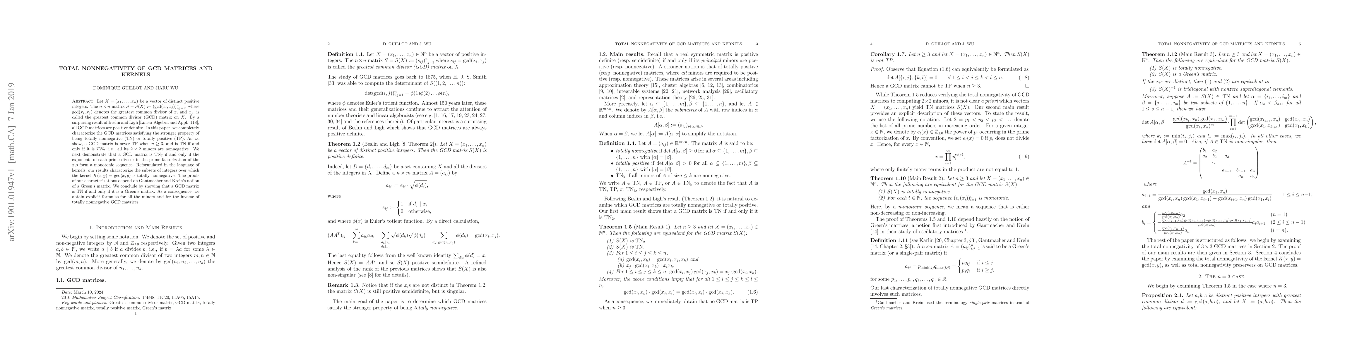 Let $X = (x_1,\dots,x_n)$ be a vector of distinct positive integers. The $n \times n$ matrix $S = S(X) := (\gcd(x_i,x_j))_{i,j=1}^n$, where $\gcd(x_i,x_j)$ denotes the greatest common divisor of $x_i$ and $x_j$, is called the greatest common divisor (GCD) matrix on $X$. By a surprising result of Beslin and Ligh [Linear Algebra and Appl. 118], all GCD matrices are positive definite. In this paper, we completely characterize the GCD matrices satisfying the stronger property of being totally nonnegative (TN) or totally positive (TP). As we show, a GCD matrix is never TP when $n \geq 3$, and is TN if and only if it is $\textrm{TN}_2$, i.e., all its $2 \times 2$ minors are nonnegative. We next demonstrate that a GCD matrix is $\textrm{TN}_2$ if and only if the exponents of each prime divisor in the prime factorization of the $x_i$s form a monotonic sequence. Reformulated in the language of kernels, our results characterize the subsets of integers over which the kernel $K(x,y) = \gcd(x,y)$ is totally nonnegative. The proofs of our characterizations depend on Gantmacher and Krein's notion of a Green's matrix. We conclude by showing that a GCD matrix is TN if and only if it is a Green's matrix. As a consequence, we obtain explicit formulas for all the minors and for the inverse of totally nonnegative GCD matrices.