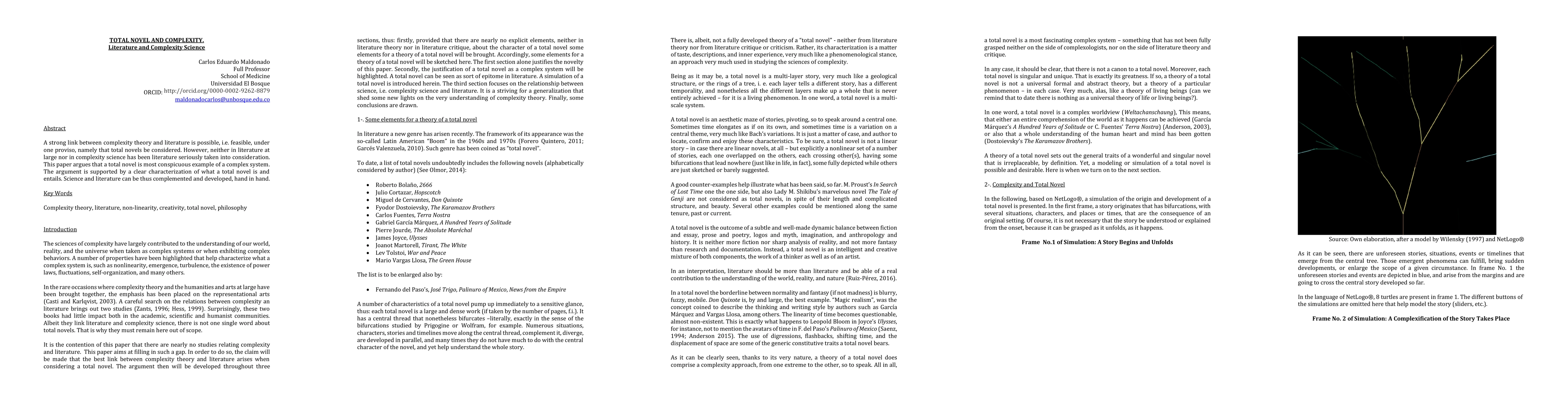 A strong link between complexity theory and literature is possible, i.e. feasible, under one proviso, namely that total novels be considered. However, neither in literature at large nor in complexity science has been literature seriously taken into consideration. This paper argues that a total novel is most conspicuous example of a complex system. The argument is supported by a clear characterization of what a total novel is and entails. Science and literature can be thus complemented and developed, hand in hand.