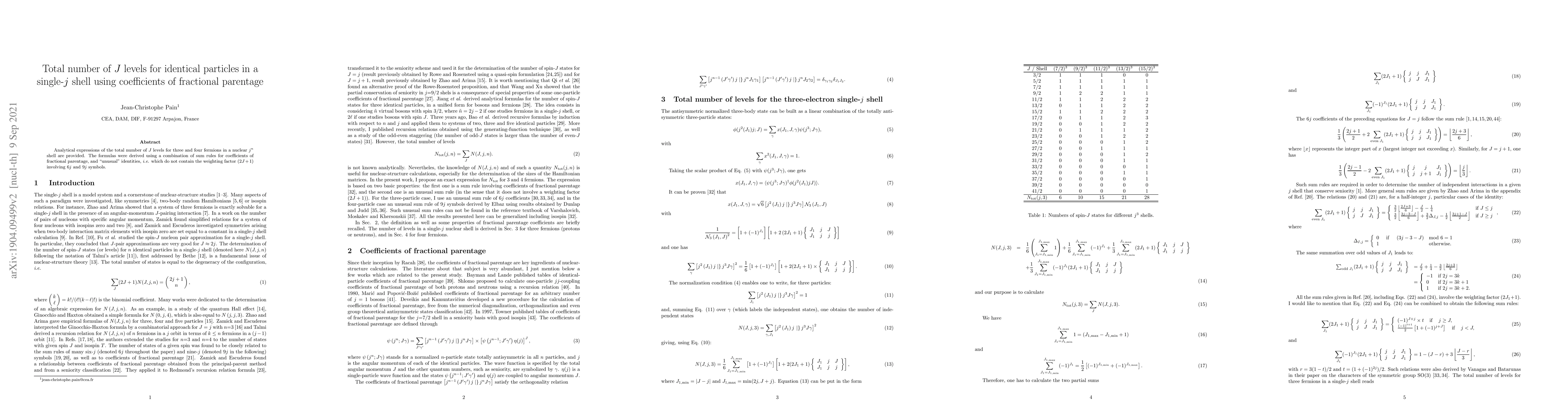 Researchers derived analytical expressions for the total number of $J$ levels for three and four fermions in a nuclear shell using sum rules and unusual identities.