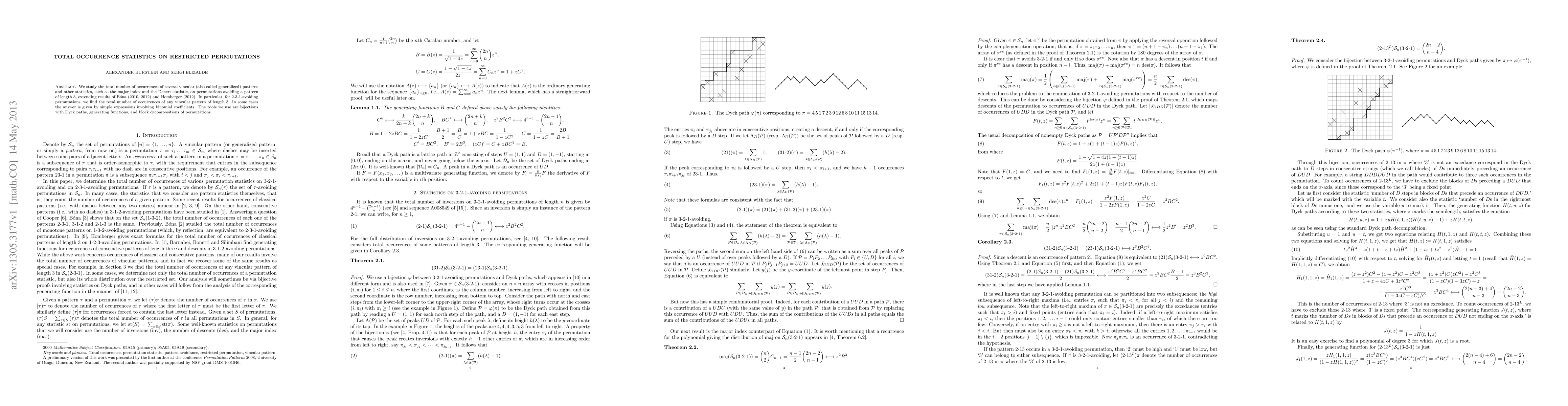 This paper investigates the total occurrences of vincular patterns and other statistics like the major index on permutations that avoid the 3-pattern 2-3-1, extending prior work. It provides explicit expressions for these occurrences using bijections, generating functions, and decompositions, revealing simple binomial coefficient formulas in some cases.