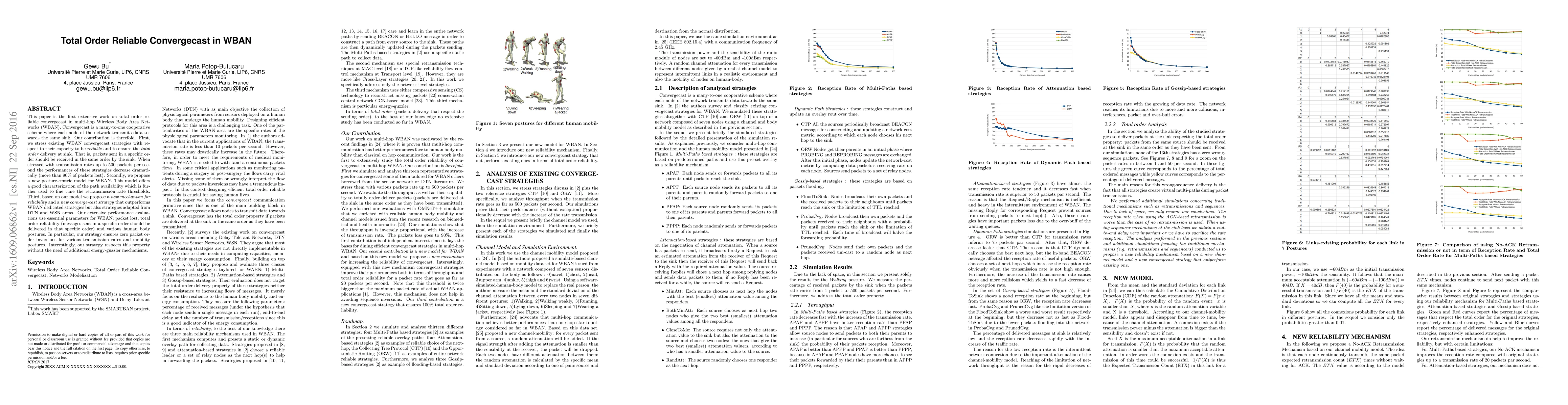 This paper is the first extensive work on total order reliable convergecast in multi-hop Wireless Body Area Networks (WBAN). Convergecast is a many-to-one cooperative scheme where each node of the network transmits data towards the same sink. Our contribution is threefold. First, we stress existing WBAN convergecast strategies with respect to their capacity to be reliable and to ensure the total order delivery at sink. That is, packets sent in a specific order should be received in the same order by the sink. When stressed with transmission rates up to 500 packets per second the performances of these strategies decrease dramatically (more than 90% of packets lost). Secondly, we propose a new posture-centric model for WBAN. This model offers a good characterization of the path availability which is further used to fine tune the retransmission rate thresholds. Third, based on our model we propose a new mechanism for reliability and a new converge-cast strategy that outperforms WBAN dedicated strategies but also strategies adapted from DTN and WSN areas. Our extensive performance evaluations use essential parameters for WBAN: packet lost, total order reliability (messages sent in a specific order should be delivered in that specific order) and various human body postures. In particular, our strategy ensures zero packet order inversions for various transmission rates and mobility postures. Interestingly, our strategy respects this property without the need of additional energy-guzzler mechanisms.