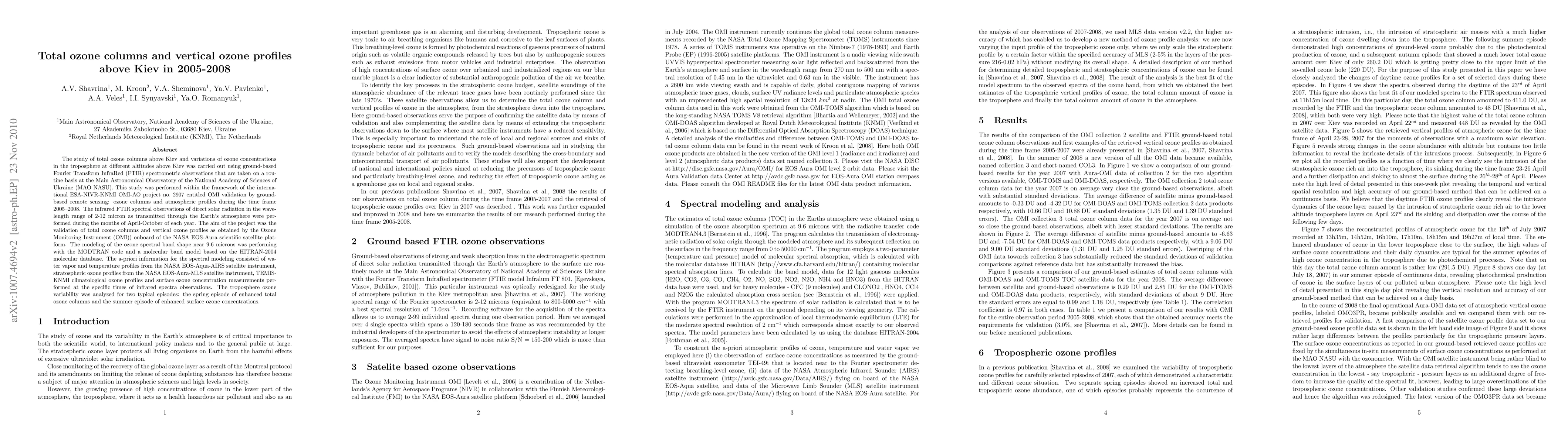 This study used ground-based FTIR spectrometry to measure total ozone columns and vertical profiles above Kiev from 2005-2008, validating OMI data and analyzing tropospheric ozone variability during spring and summer episodes.
