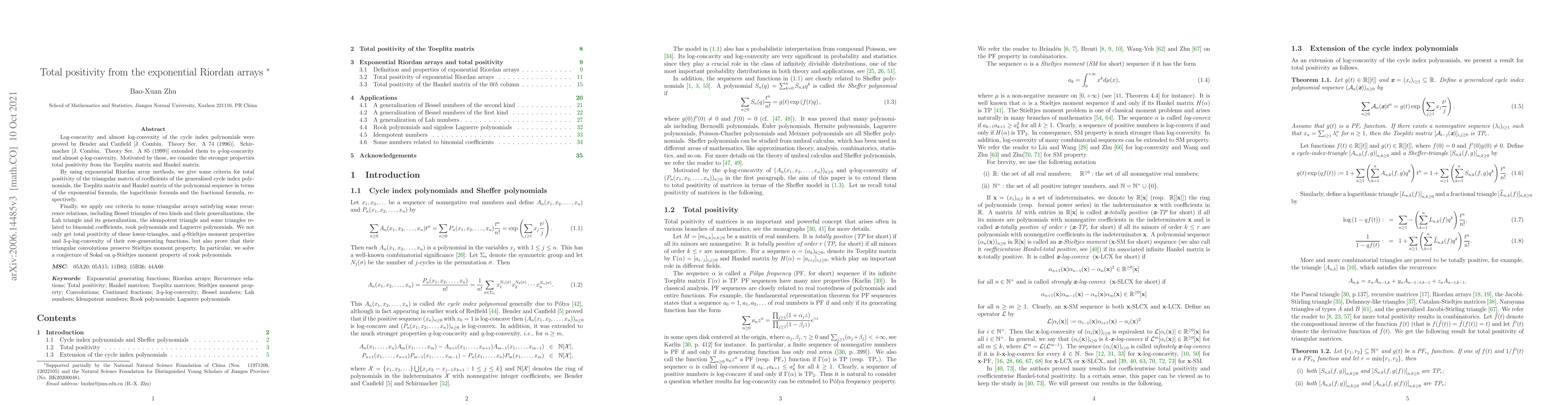 This paper explores total positivity within exponential Riordan arrays, providing criteria for such positivity in triangular matrices of generalized cycle index polynomials, Toeplitz matrices, and Hankel matrices. It applies these criteria to various triangular arrays, proving their total positivity and additional properties like $q$-Stieltjes moment properties, and solving a conjecture regarding rook polynomials.