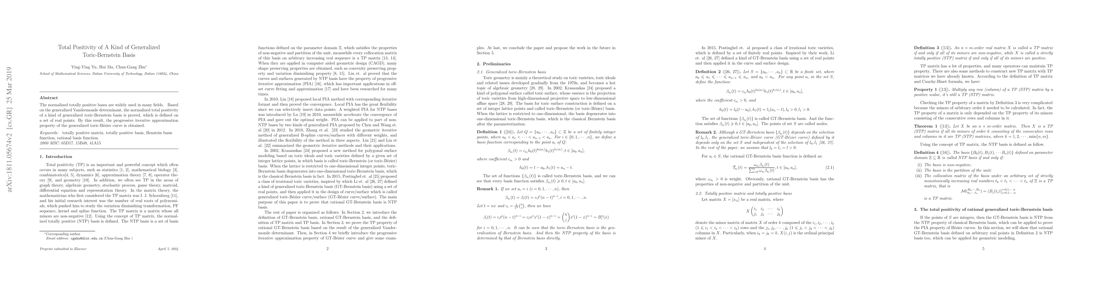 This paper proves the normalized total positivity of a generalized toric-Bernstein basis based on the generalized Vandermonde determinant, establishing its progressive iterative approximation property for the generalized toric-Bézier curve.