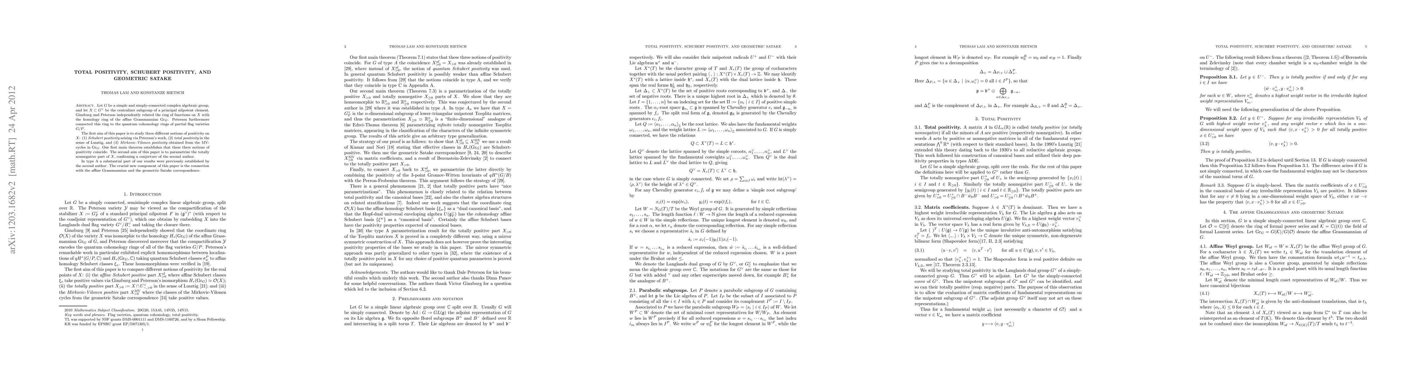 Let G be a simple and simply-connected complex algebraic group, and let X \subset G^\vee be the centralizer subgroup of a principal nilpotent element. Ginzburg and Peterson independently related the ring of functions on X with the homology ring of the affine Grassmannian Gr_G. Peterson furthermore connected this ring to the quantum cohomology rings of partial flag varieties G/P. The first aim of this paper is to study three different notions of positivity on X: (1) Schubert positivity arising via Peterson's work, (2) total positivity in the sense of Lusztig, and (3) Mirkovic-Vilonen positivity obtained from the MV-cycles in Gr_G. Our first main theorem establishes that these three notions of positivity coincide. The second aim of this paper is to parametrize the totally nonnegative part of X, confirming a conjecture of the second author. In type A a substantial part of our results were previously established by the second author. The crucial new component of this paper is the connection with the affine Grassmannian and the geometric Satake correspondence.