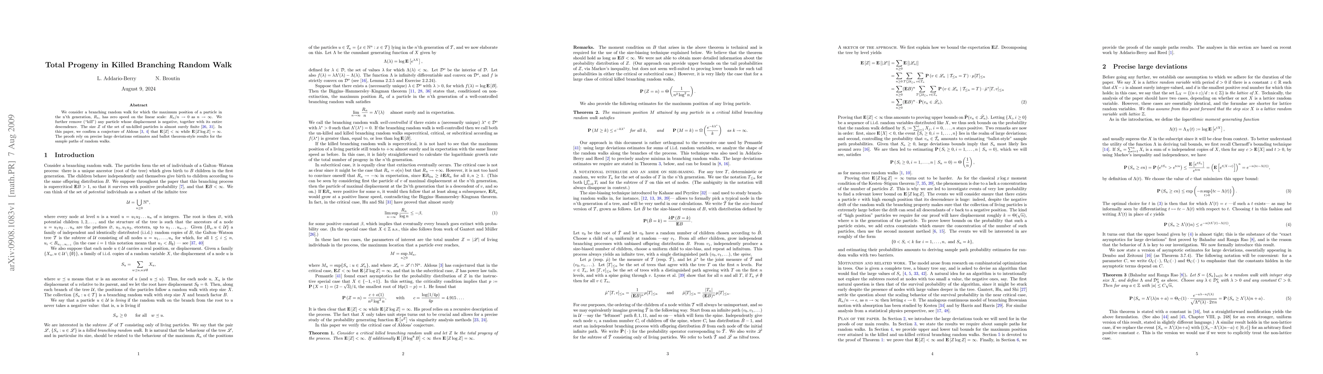 A study confirms a conjecture on a branching random walk where particles with negative displacement are 'killed', showing that the expected size of un-killed particles approaches infinity but its logarithm does not.