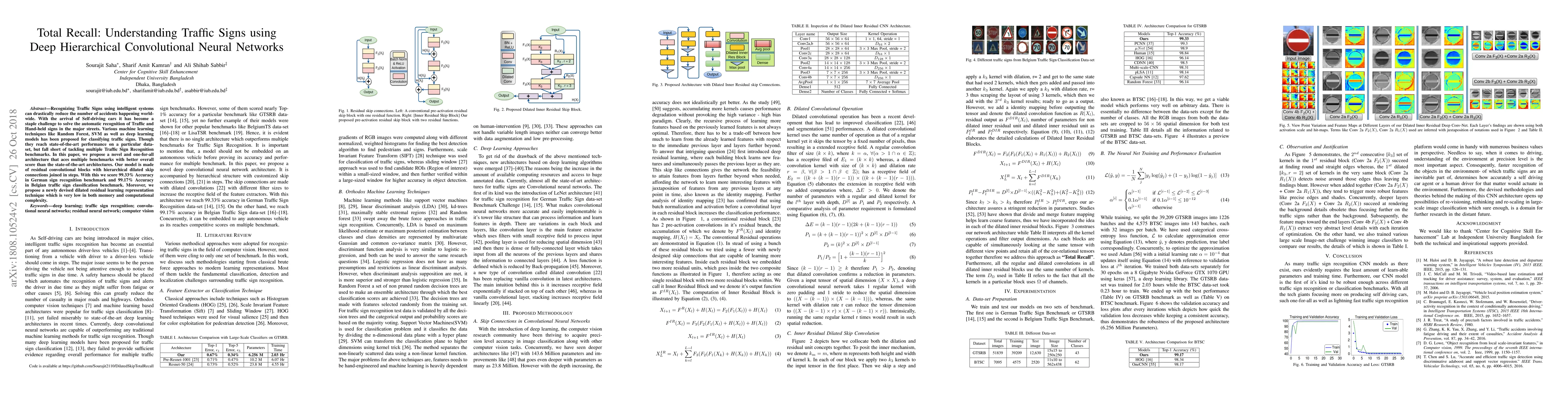 This paper presents a novel deep learning architecture for traffic sign recognition, achieving high accuracy (99.33% in German and 99.17% in Belgian benchmarks) using residual convolutional blocks and hierarchical dilated skip connections. It also introduces a low-complexity dilated residual learning representation technique.
