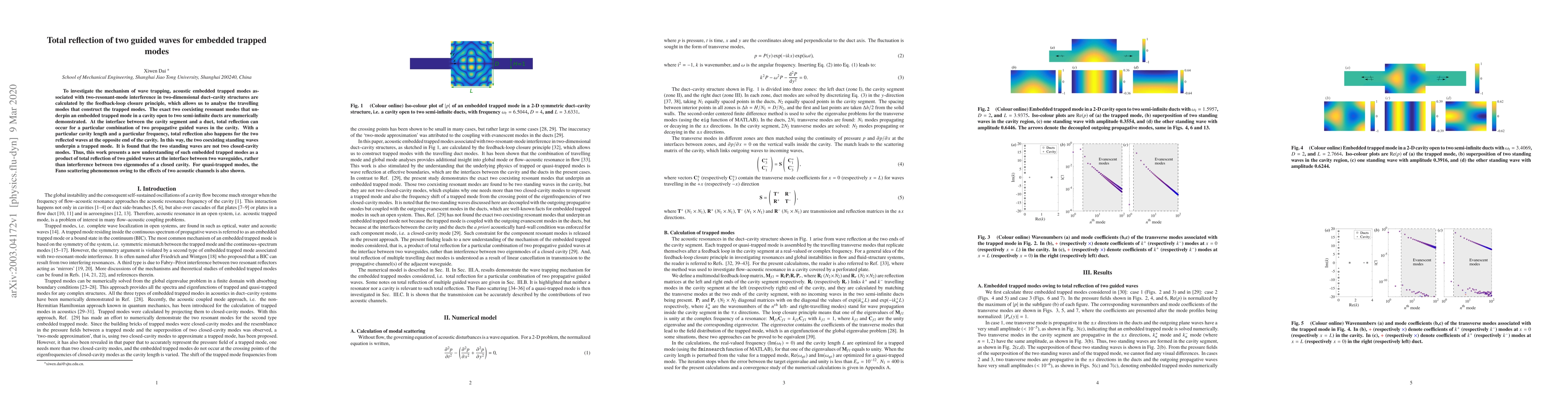 To investigate the mechanism of wave trapping, acoustic embedded trapped modes associated with two-resonant-mode interference in two-dimensional duct-cavity structures are calculated by the feedback-loop closure principle, which allows us to analyse the travelling modes that construct the trapped modes. The exact two coexisting resonant modes that underpin an embedded trapped mode in a cavity open to two semi-infinite ducts are numerically demonstrated. At the interface between the cavity segment and a duct, total reflection can occur for a particular combination of two propagative guided waves in the cavity. With a particular cavity length and a particular frequency, total reflection also happens for the two reflected waves at the opposite end of the cavity. In this way, the two coexisting standing waves underpin a trapped mode. It is found that the two standing waves are not two closed-cavity modes. Thus, this work presents a new understanding of such embedded trapped modes as a product of total reflection of two guided waves at the interface between two waveguides, rather than interference between two eigenmodes of a closed cavity. For quasi-trapped modes, the Fano scattering phenomenon owing to the effects of two acoustic channels is also shown.