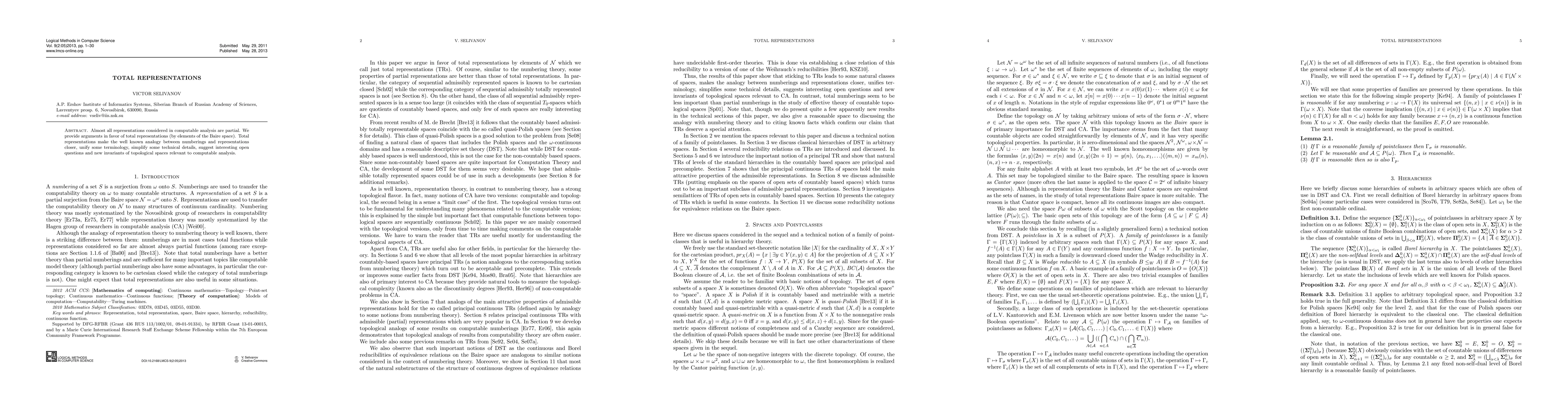 Almost all representations considered in computable analysis are partial. We provide arguments in favor of total representations (by elements of the Baire space). Total representations make the well known analogy between numberings and representations closer, unify some terminology, simplify some technical details, suggest interesting open questions and new invariants of topological spaces relevant to computable analysis.