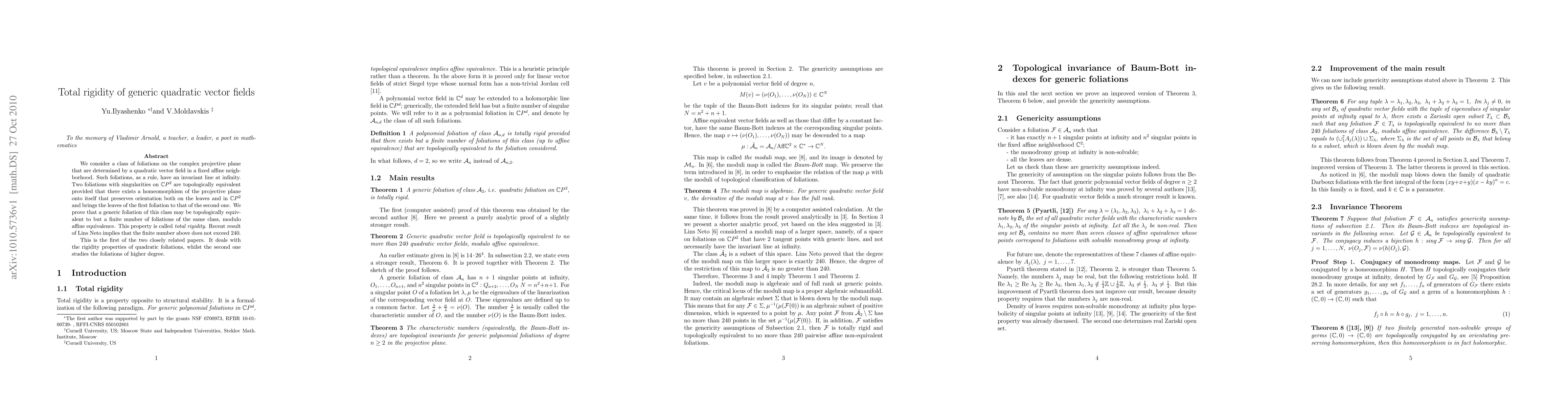 This paper establishes that generic quadratic vector fields on the complex projective plane exhibit total rigidity, meaning they can be topologically equivalent to only a finite number of other foliations within the same class, specifically no more than 240, as per Lins Neto's result. The study focuses on the topological equivalence under orientation-preserving homeomorphisms.
