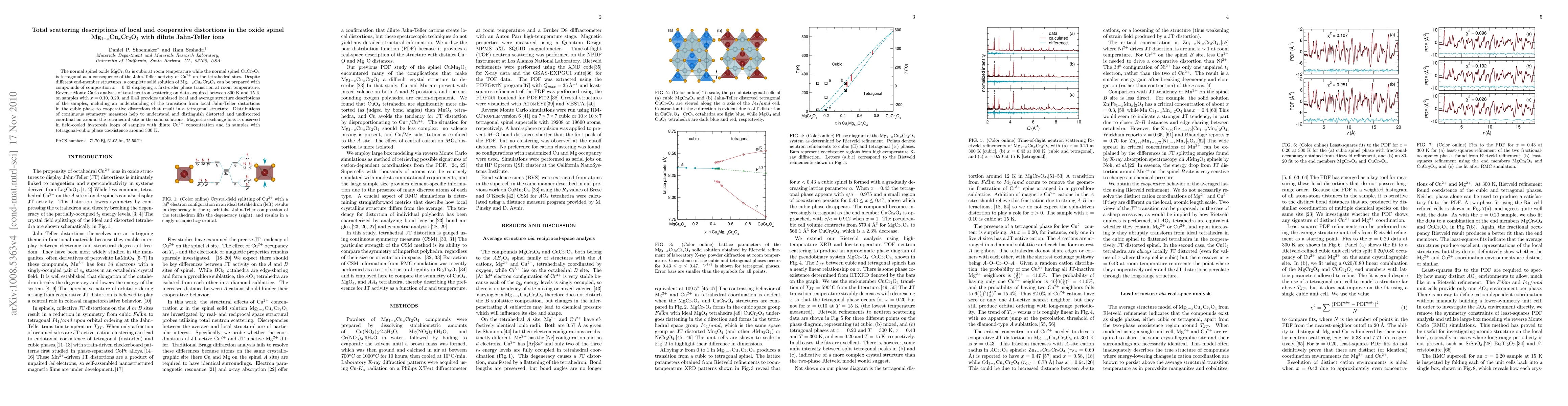The normal spinel oxide MgCr2O4 is cubic at room temperature while the normal spinel CuCr2O4 is tetragonal as a consequence of the Jahn-Teller nature of Cu2+ on the tetrahedral sites. Despite different end-member structures, complete solid solutions of Mg_{1-x}Cu_xCr2O4 can be prepared that display a first-order structural transition with composition x = 0.43 at room temperature. Reverse Monte Carlo analysis of total neutron scattering on data acquired between 300 K and 15 K on samples with x = 0.10, 0.20, and 0.43 provides unbiased local and average structure descriptions of the samples, including an understanding of the transition from local Jahn-Teller distortions in the cubic phase to cooperative distortions that result in a tetragonal structure. Distributions of continuous symmetry measures help to understand and distinguish distorted and undistorted coordination around the tetrahedral site in the solid solutions. Magnetic exchange bias is observed in field-cooled hysteresis loops of samples with dilute Cu2+ concentration and in samples with tetragonal--cubic phase coexistence around 300 K.