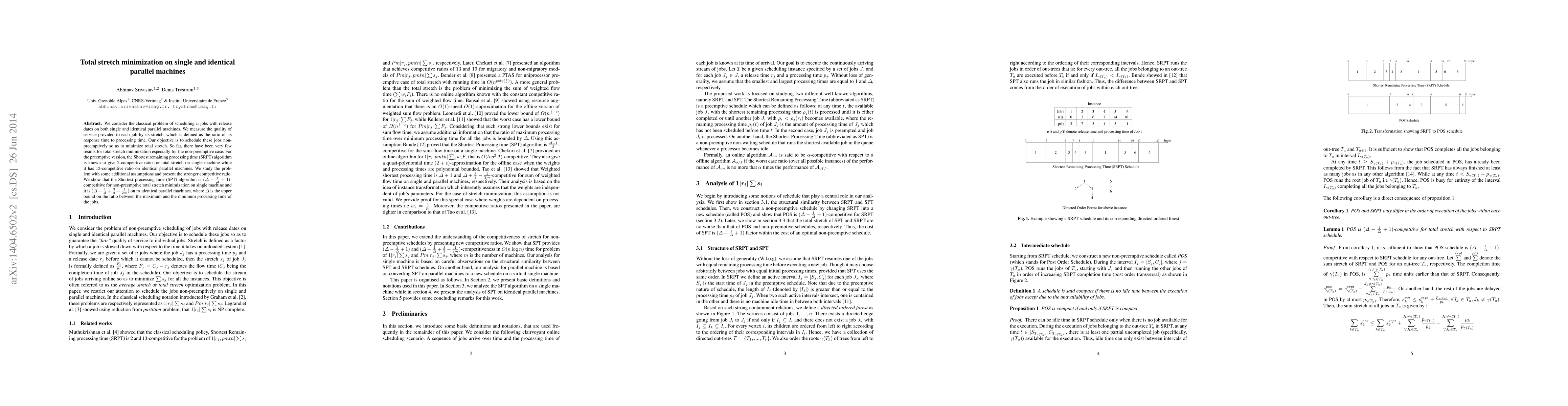 This paper addresses the problem of minimizing the total stretch in scheduling $n$ jobs on single or identical parallel machines, focusing on non-preemptive scheduling. It introduces new competitive ratios for the Shortest processing time (SPT) algorithm, showing it achieves $\Delta - \frac{1}{\Delta}+1$ competitiveness for single machines and $\Delta - \frac{1}{\Delta}+ \frac{3}{2} -\frac{1}{2m}$ for $m$ parallel machines, where $\Delta$ is the ratio of maximum to minimum job processing times.