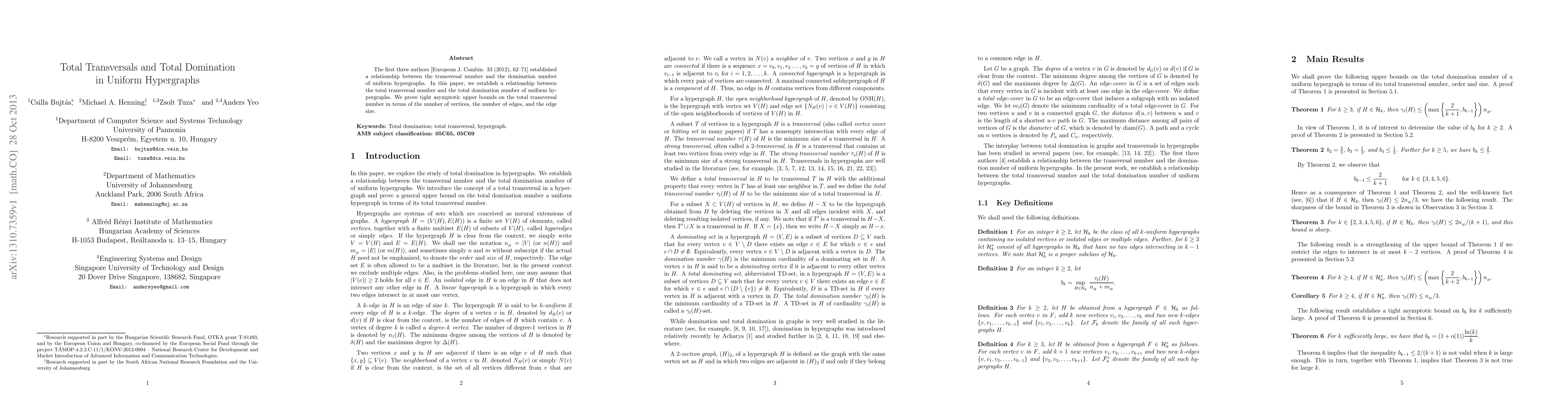 This paper investigates the relationship between the total transversal number and the total domination number in uniform hypergraphs, proving tight asymptotic upper bounds on the total transversal number based on the hypergraph's vertex count, edge count, and edge size.
