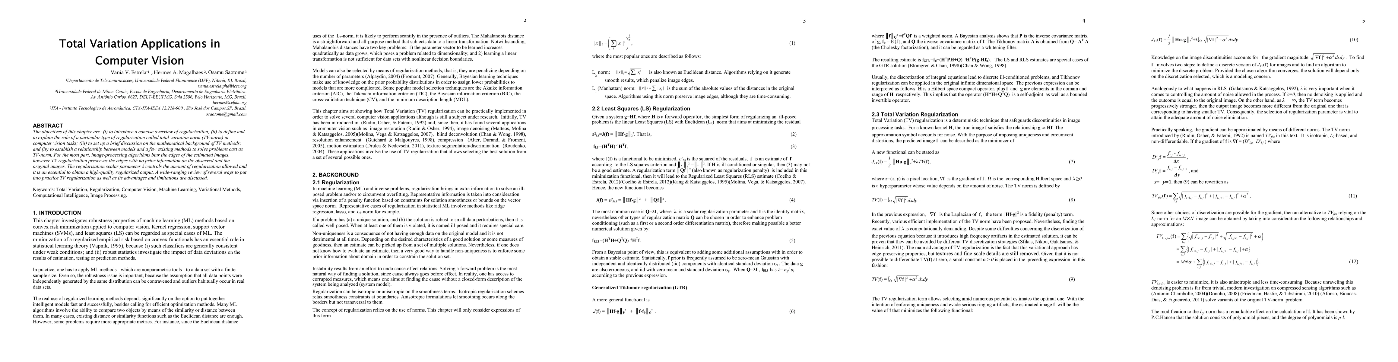 This paper provides an overview of regularization techniques, focusing on total variation norm (TV-norm) in computer vision. It highlights how TV regularization preserves image edges without prior information, contrasting it with blurring effects in other image-processing algorithms. The paper also discusses the mathematical background of TV methods and their practical applications, along with the role of the regularization parameter λ in achieving high-quality results.