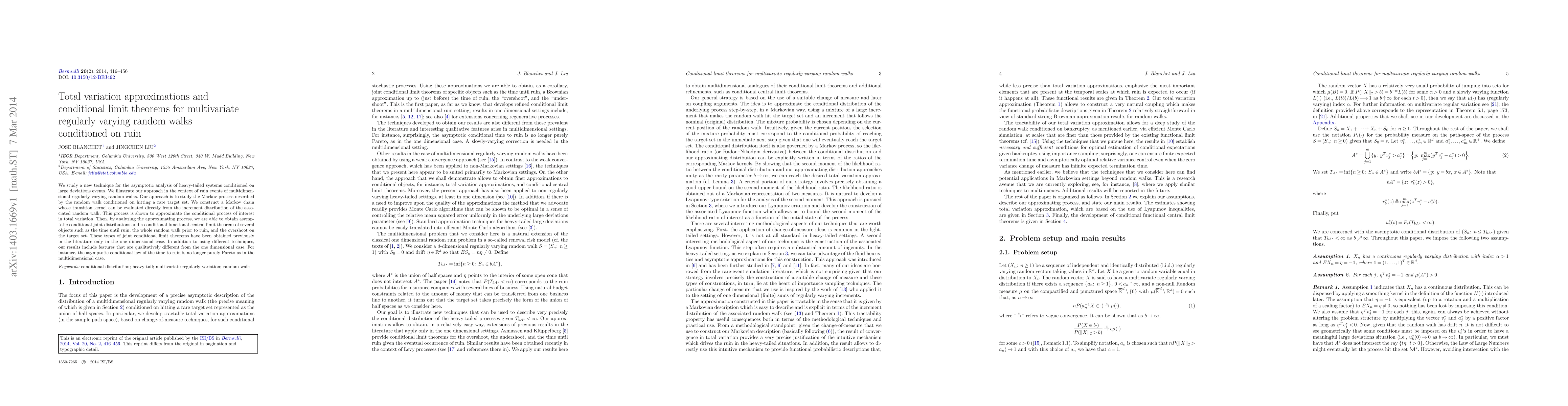 We study a new technique for the asymptotic analysis of heavy-tailed systems conditioned on large deviations events. We illustrate our approach in the context of ruin events of multidimensional regularly varying random walks. Our approach is to study the Markov process described by the random walk conditioned on hitting a rare target set. We construct a Markov chain whose transition kernel can be evaluated directly from the increment distribution of the associated random walk. This process is shown to approximate the conditional process of interest in total variation. Then, by analyzing the approximating process, we are able to obtain asymptotic conditional joint distributions and a conditional functional central limit theorem of several objects such as the time until ruin, the whole random walk prior to ruin, and the overshoot on the target set. These types of joint conditional limit theorems have been obtained previously in the literature only in the one dimensional case. In addition to using different techniques, our results include features that are qualitatively different from the one dimensional case. For instance, the asymptotic conditional law of the time to ruin is no longer purely Pareto as in the multidimensional case.