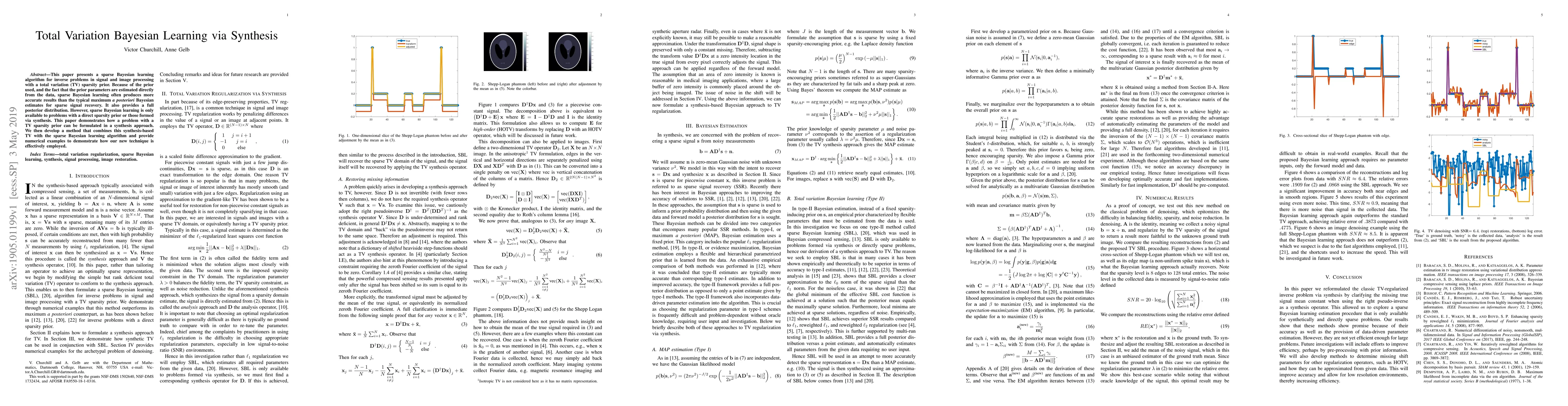 This paper presents a sparse Bayesian learning algorithm for inverse problems in signal and image processing with a total variation (TV) sparsity prior. Because of the prior used, and the fact that the prior parameters are estimated directly from the data, sparse Bayesian learning often produces more accurate results than the typical maximum a posteriori Bayesian estimates for sparse signal recovery. It also provides a full posterior distribution. However, sparse Bayesian learning is only available to problems with a direct sparsity prior or those formed via synthesis. This paper demonstrates how a problem with a TV sparsity prior can be formulated in a synthesis approach. We then develop a method that combines this synthesis-based TV with the sparse Bayesian learning algorithm and provide numerical examples to demonstrate how our new technique is effectively employed.