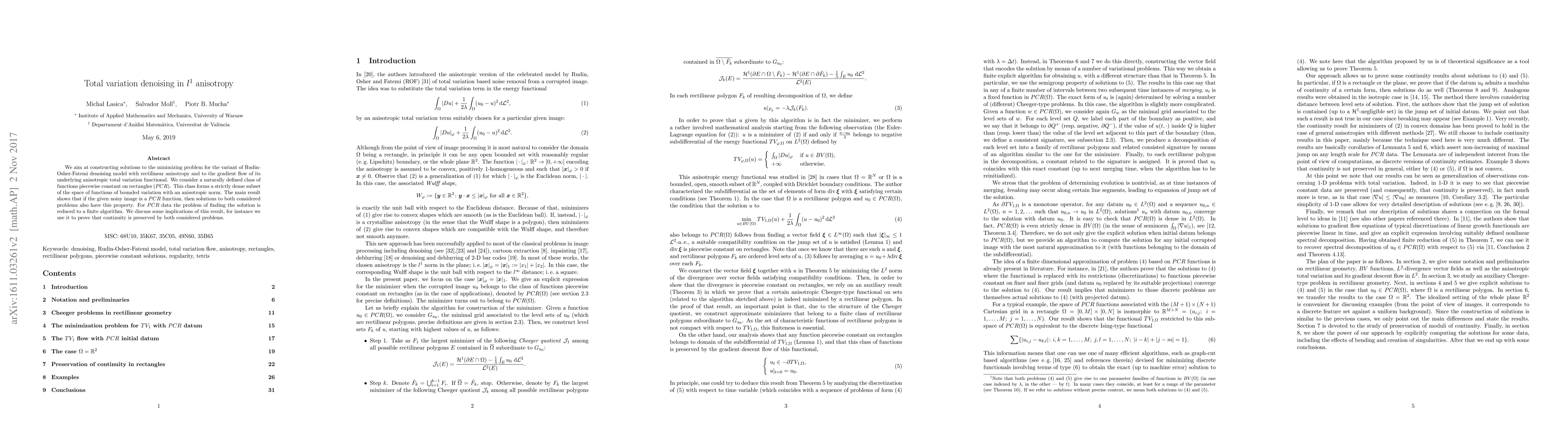 This paper constructs solutions for a variant of the Rudin-Osher-Fatemi denoising model with rectilinear anisotropy, demonstrating that if the noisy image is piecewise constant on rectangles, the denoised solution retains this property. The method reduces the problem to a finite algorithm for such data, and proves that continuity is preserved in the denoising process.