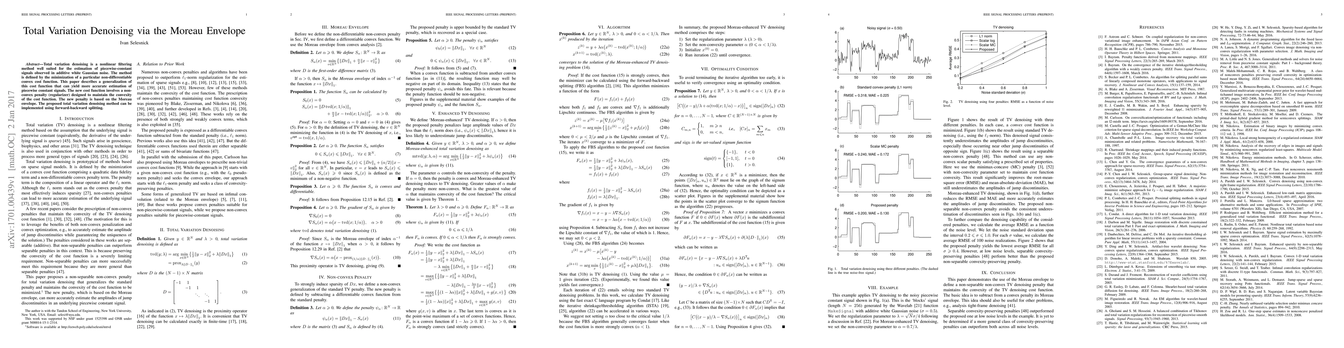 Total variation denoising is a nonlinear filtering method well suited for the estimation of piecewise-constant signals observed in additive white Gaussian noise. The method is defined by the minimization of a particular non-differentiable convex cost function. This paper describes a generalization of this cost function that can yield more accurate estimation of piecewise constant signals. The new cost function involves a non-convex penalty (regularizer) designed to maintain the convexity of the cost function. The new penalty is based on the Moreau envelope. The proposed total variation denoising method can be implemented using forward-backward splitting.