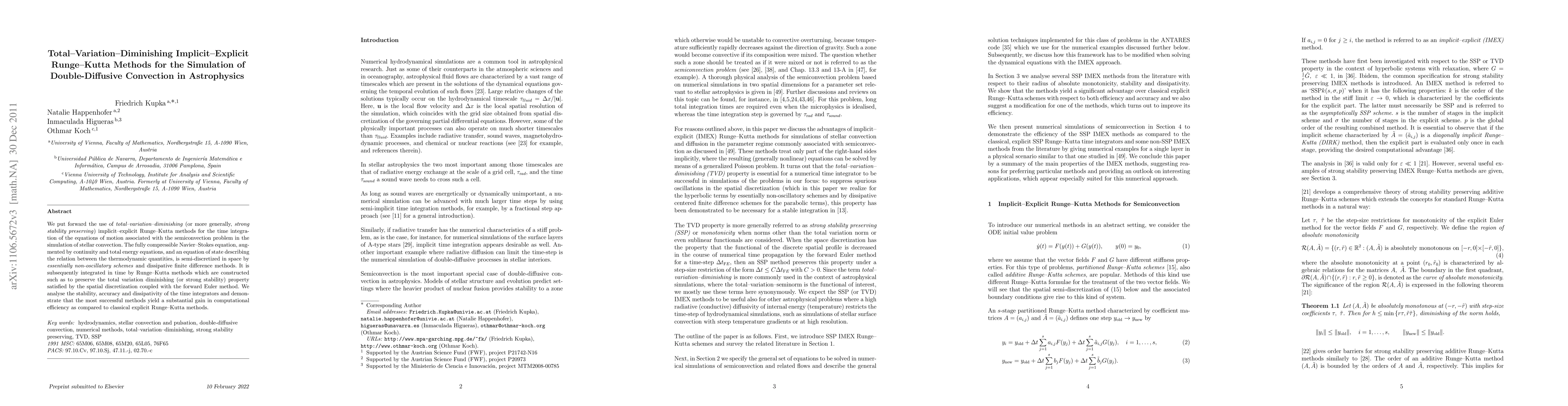 This paper proposes total-variation-diminishing implicit-explicit Runge-Kutta methods for simulating double-diffusive convection in astrophysics, achieving substantial computational efficiency gains compared to classical explicit methods. The methods preserve the stability and accuracy of spatial discretizations while integrating the fully compressible Navier-Stokes equations.