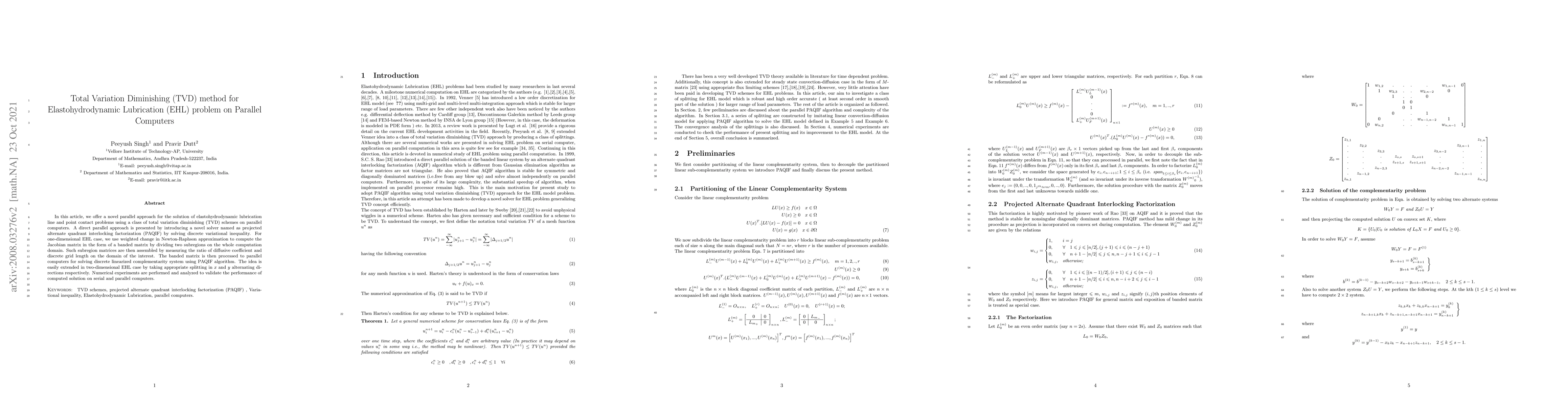 In this article, we offer a novel numerical approach for the solution of elastohydrodynamic lubrication line and point contact problems using a class of total variation diminishing (TVD) schemes on parallel computers. A direct parallel approach is presented by introducing a novel solver named as projected alternate quadrant interlocking factorization (PAQIF) by solving discrete variational inequality. For one-dimensional EHL case, we use weighted change in Newton-Raphson approximation to compute the Jacobian matrix in the form of a banded matrix by dividing two subregions on the whole computation domain. Such subregion matrices are assembled by measuring the ratio of diffusive coefficient and discrete grid length on the domain of the interest. The banded matrix is then processed to parallel computers for solving discrete linearized complementarity system using PAQIF algorithm. The idea is easily extended in two-dimensional EHL case by taking appropriate splitting in x and y alternating directions respectively. Numerical experiments are performed and analyzed to validate the performance of computed solution on serial and parallel computers.