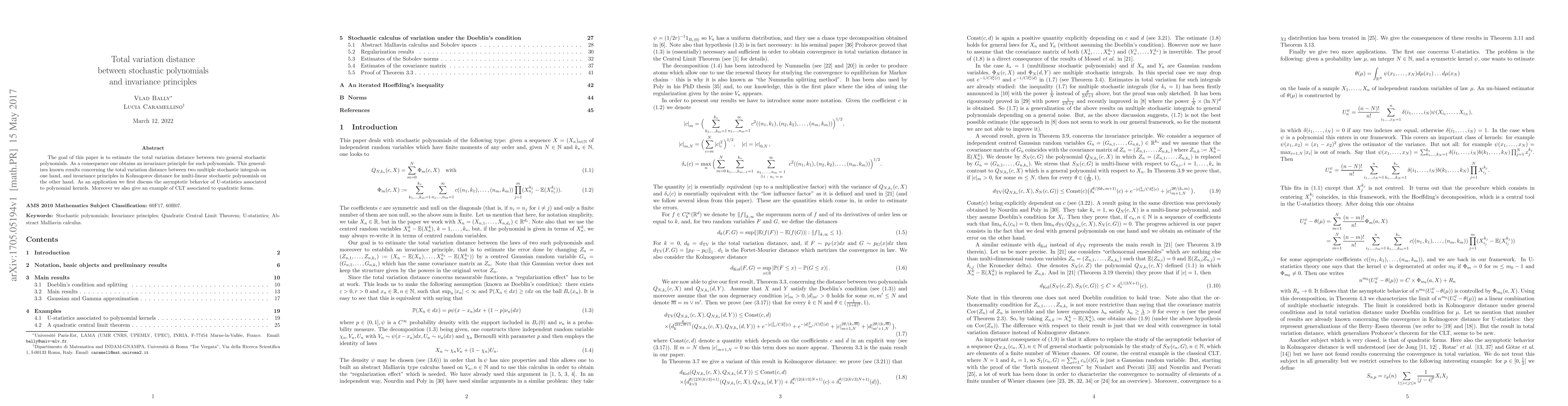 This paper estimates the total variation distance between general stochastic polynomials, leading to an invariance principle. It generalizes existing results on multiple stochastic integrals and provides insights into the asymptotic behavior of U-statistics associated with polynomial kernels, along with an example of a central limit theorem for quadratic forms.