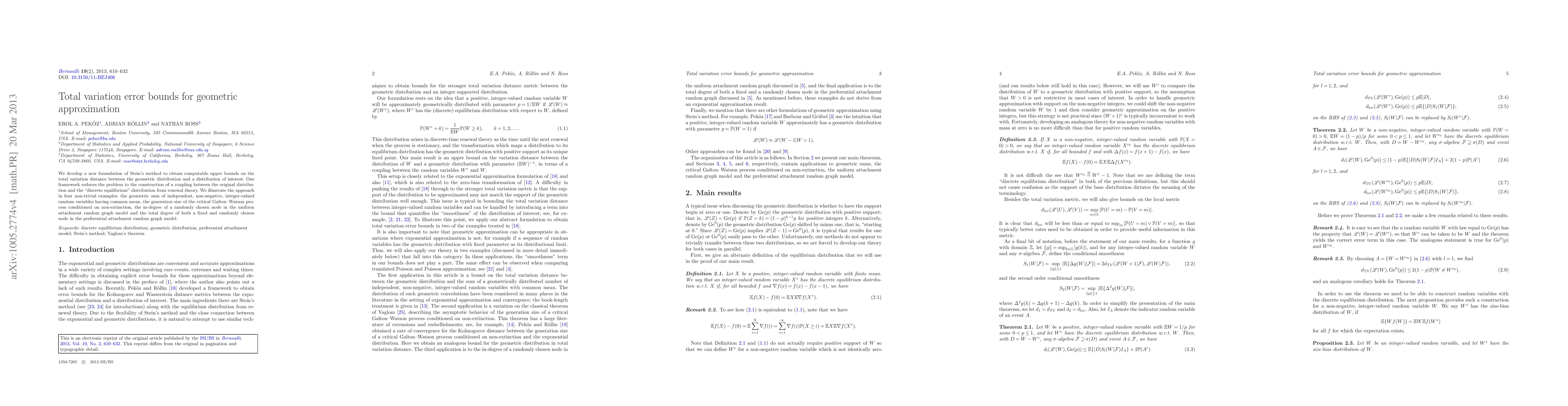 We develop a new formulation of Stein's method to obtain computable upper bounds on the total variation distance between the geometric distribution and a distribution of interest. Our framework reduces the problem to the construction of a coupling between the original distribution and the "discrete equilibrium" distribution from renewal theory. We illustrate the approach in four non-trivial examples: the geometric sum of independent, non-negative, integer-valued random variables having common mean, the generation size of the critical Galton-Watson process conditioned on non-extinction, the in-degree of a randomly chosen node in the uniform attachment random graph model and the total degree of both a fixed and randomly chosen node in the preferential attachment random graph model.