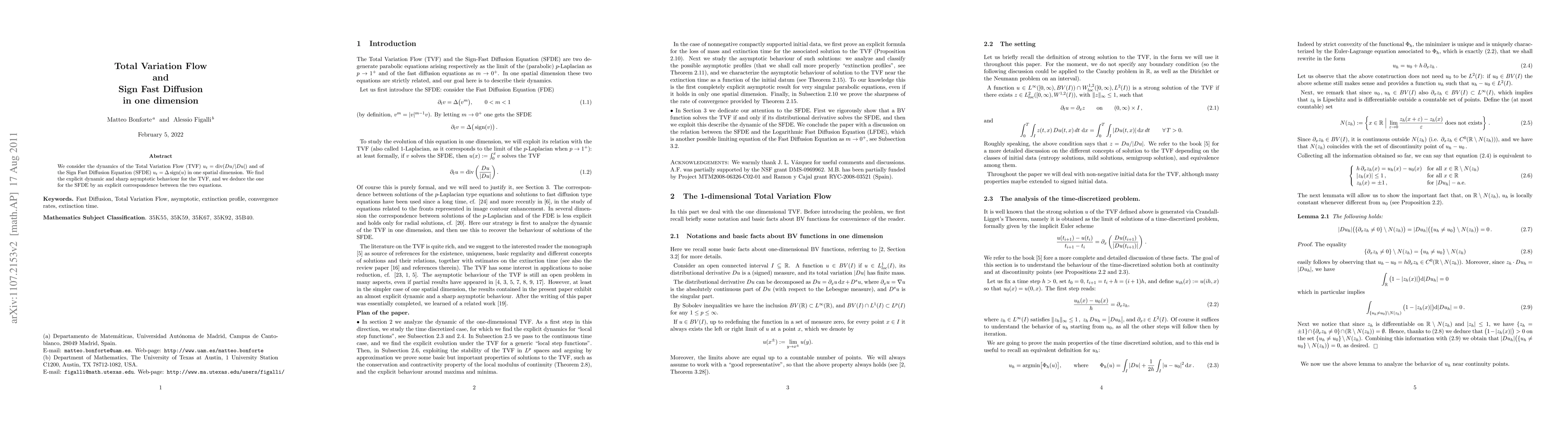 We consider the dynamics of the Total Variation Flow (TVF) $u_t=\div(Du/|Du|)$ and of the Sign Fast Diffusion Equation (SFDE) $u_t=\Delta\sign(u)$ in one spatial dimension. We find the explicit dynamic and sharp asymptotic behaviour for the TVF, and we deduce the one for the SFDE by an explicit correspondence between the two equations.