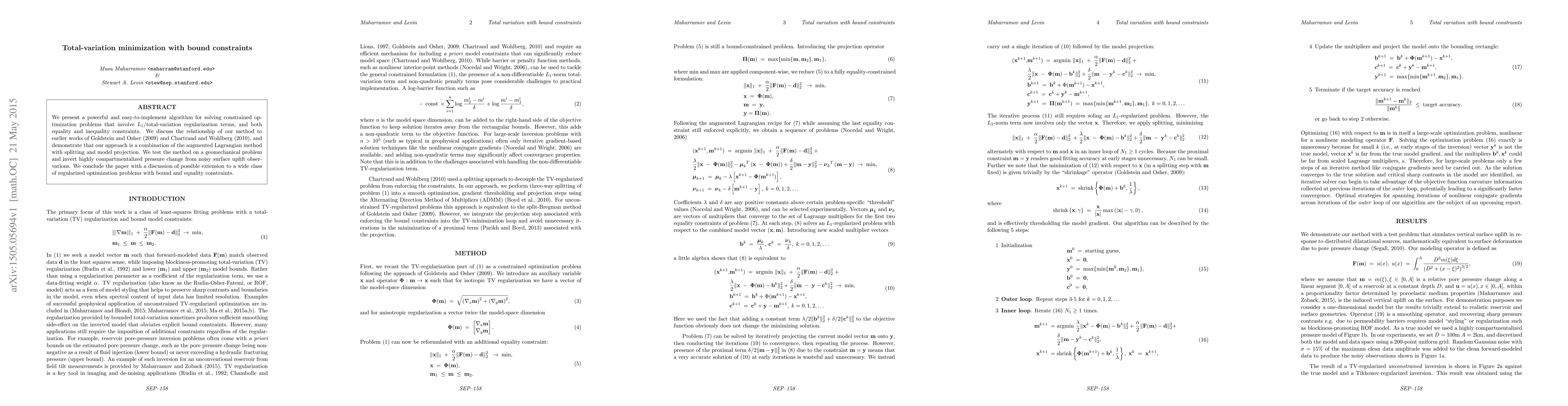 We present a powerful and easy-to-implement algorithm for solving constrained optimization problems that involve $L_1$/total-variation regularization terms, and both equality and inequality constraints. We discuss the relationship of our method to earlier works of Goldstein and Osher (2009) and Chartrand and Wohlberg (2010), and demonstrate that our approach is a combination of the augmented Lagrangian method with splitting and model projection. We test the method on a geomechanical problem and invert highly compartmentalized pressure change from noisy surface uplift observations. We conclude the paper with a discussion of possible extension to a wide class of regularized optimization problems with bound and equality constraints.