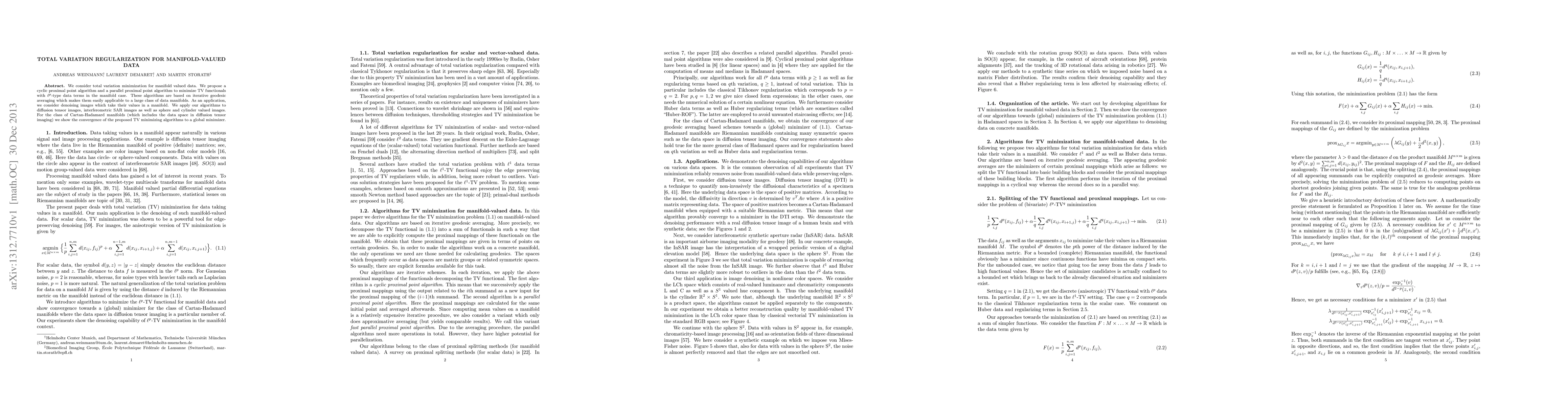 This paper proposes algorithms for total variation regularization on manifold-valued data, utilizing cyclic and parallel proximal point methods based on geodesic averaging. The algorithms are applied to denoise various types of manifold-valued images, demonstrating convergence for Cartan-Hadamard manifolds.