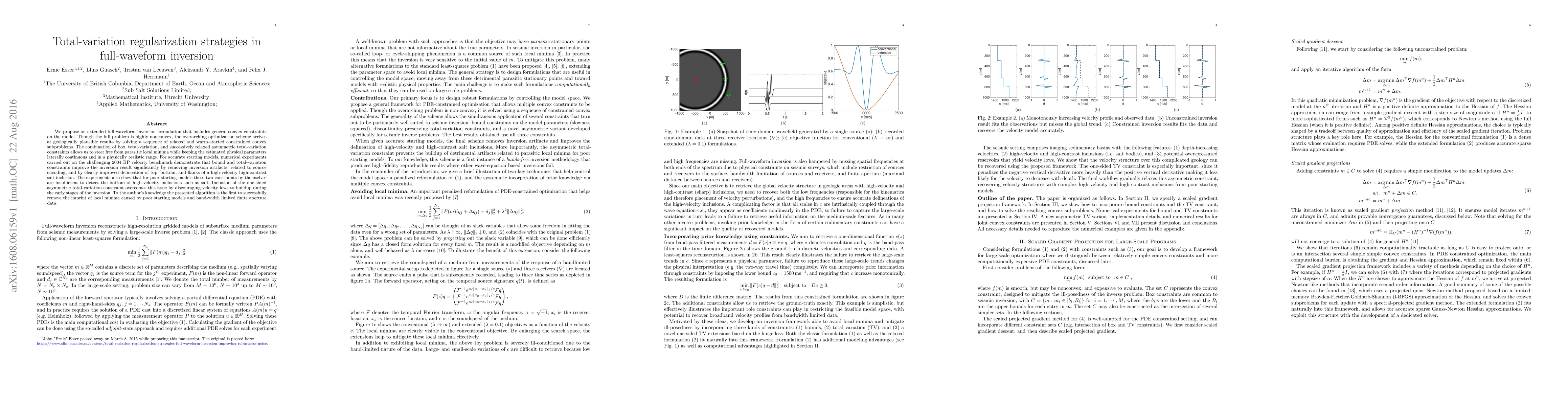 This paper proposes an advanced full-waveform inversion method incorporating total-variation regularization to improve geological model accuracy. The approach effectively mitigates inversion artifacts and enhances the delineation of geological features, though it requires additional asymmetric total-variation constraints for poor starting models.