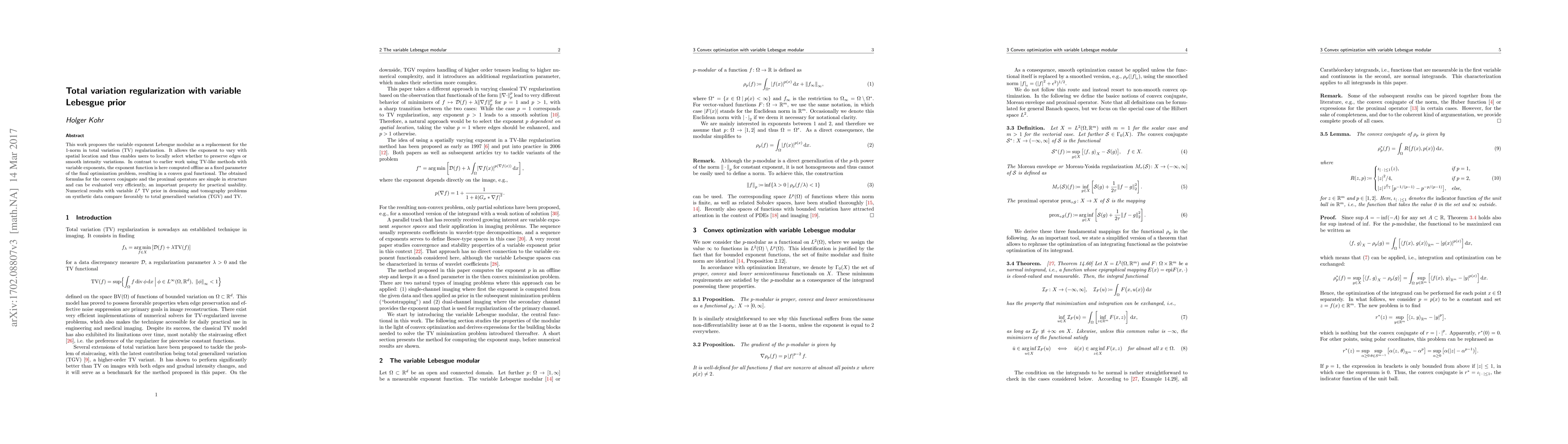 This paper introduces a variable exponent Lebesgue modular as an alternative to the 1-norm in total variation regularization, allowing local control over edge preservation or smoothing. The method results in a convex optimization problem, facilitating efficient computation and practical application, with numerical results showing improved performance in denoising and tomography.