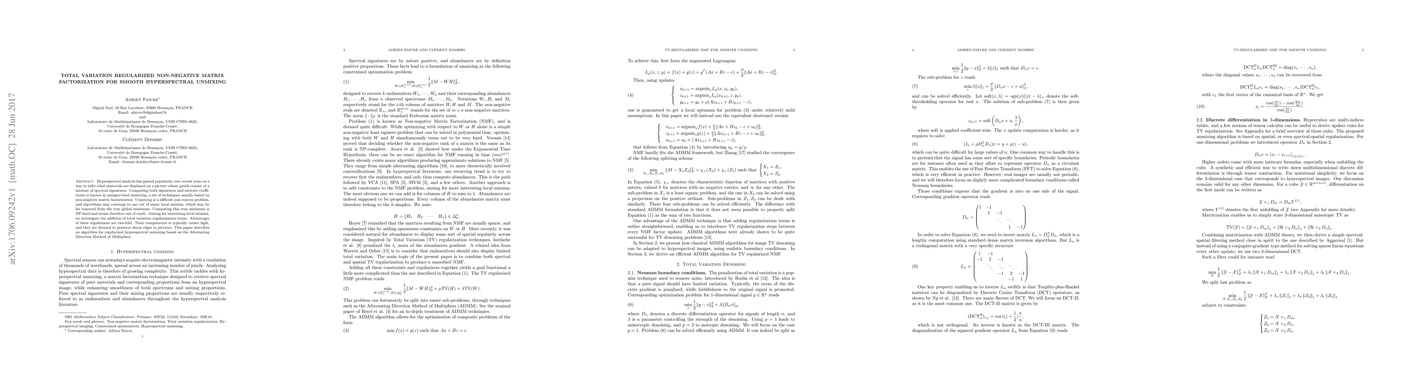 Hyperspectral analysis has gained popularity over recent years as a way to infer what materials are displayed on a picture whose pixels consist of a mixture of spectral signatures. Computing both signatures and mixture coefficients is known as unsupervised unmixing, a set of techniques usually based on non-negative matrix factorization. Unmixing is a difficult non-convex problem, and algorithms may converge to one out of many local minima, which may be far removed from the true global minimum. Computing this true minimum is NP-hard and seems therefore out of reach. Aiming for interesting local minima, we investigate the addition of total variation regularization terms. Advantages of these regularizers are two-fold. Their computation is typically rather light, and they are deemed to preserve sharp edges in pictures. This paper describes an algorithm for regularized hyperspectral unmixing based on the Alternating Direction Method of Multipliers.
