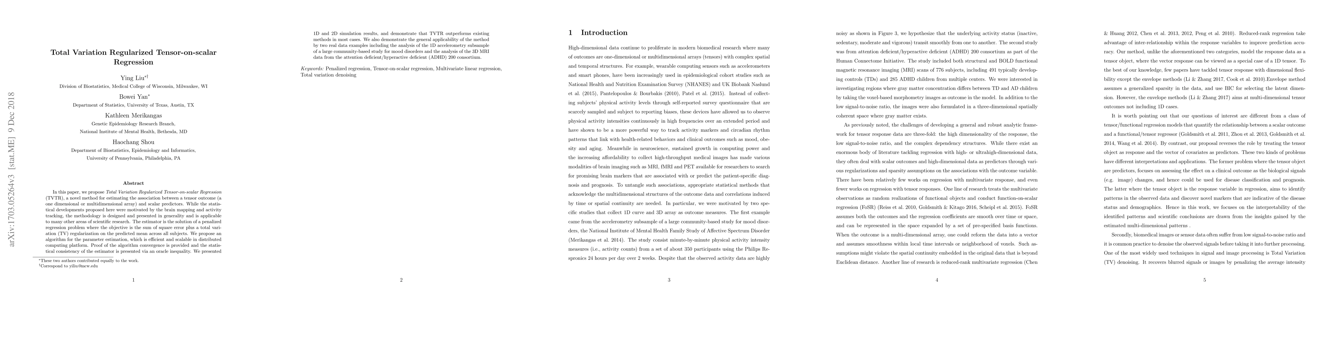 This paper introduces Total Variation Regularized Tensor-on-scalar Regression (TVTR) to estimate associations between tensor outcomes and scalar predictors, with applications in brain mapping and beyond. The method employs a penalized regression approach and demonstrates superior performance over existing methods in simulations and real data examples.