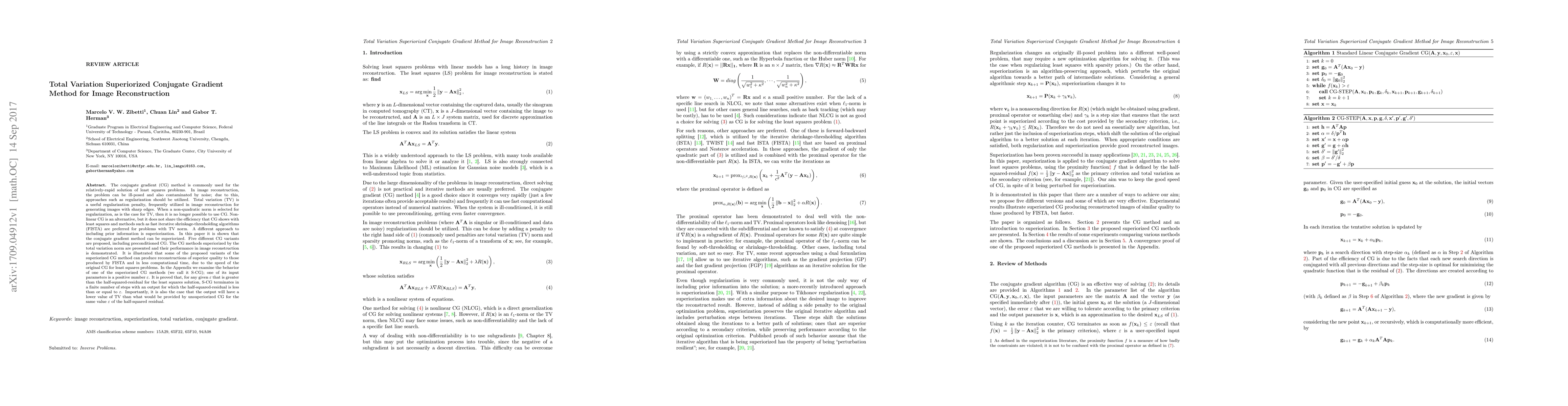 This paper proposes superiorized conjugate gradient methods incorporating total variation regularization for image reconstruction, demonstrating that these variants can achieve higher quality reconstructions than FISTA while maintaining computational efficiency.