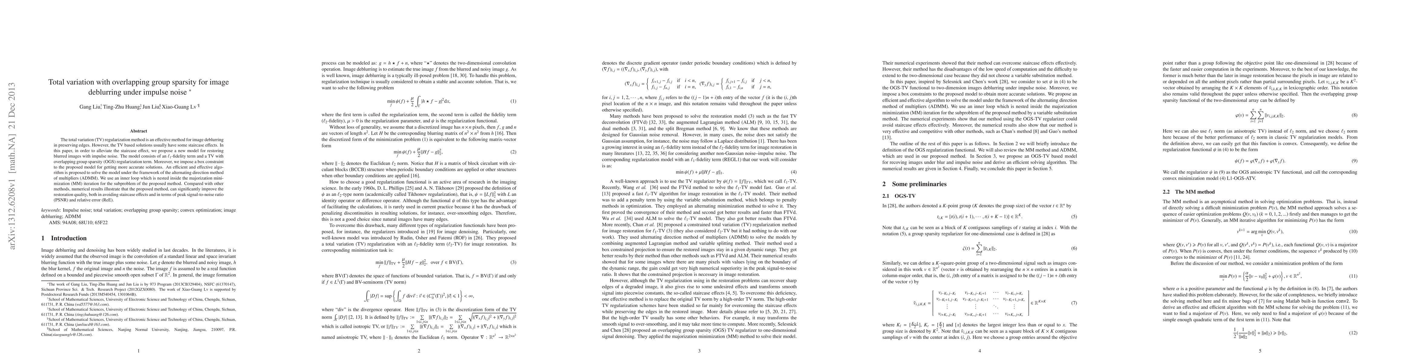 This paper proposes a new model for image deblurring under impulse noise that combines an $\ell_1$-fidelity term with total variation regularization using overlapping group sparsity to mitigate staircase effects. An efficient algorithm based on ADMM and MM is developed to solve the model, achieving superior restoration quality in terms of PSNR and ReE compared to existing methods.