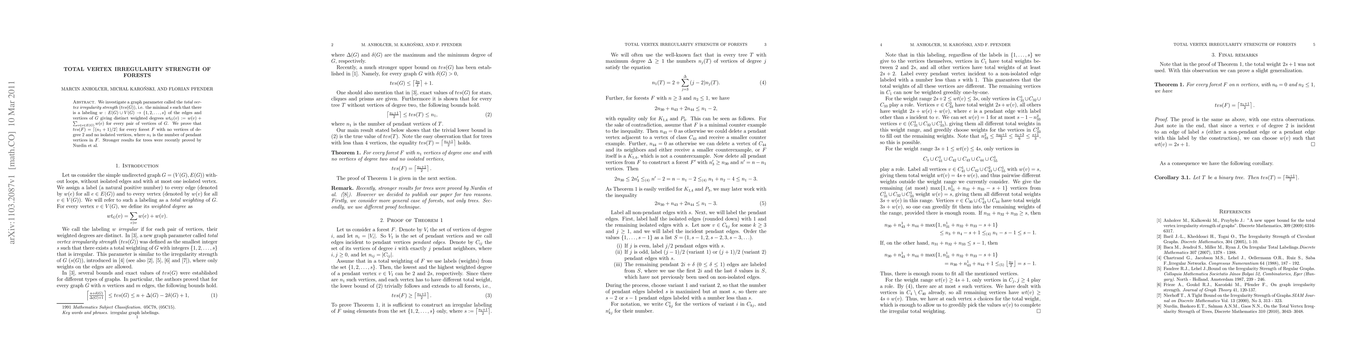 A new graph parameter called total vertex irregularity strength is introduced and proven for forest graphs with specific conditions, resulting in a formula of ⌊ (n1+1)/2 for the number of pendant vertices.