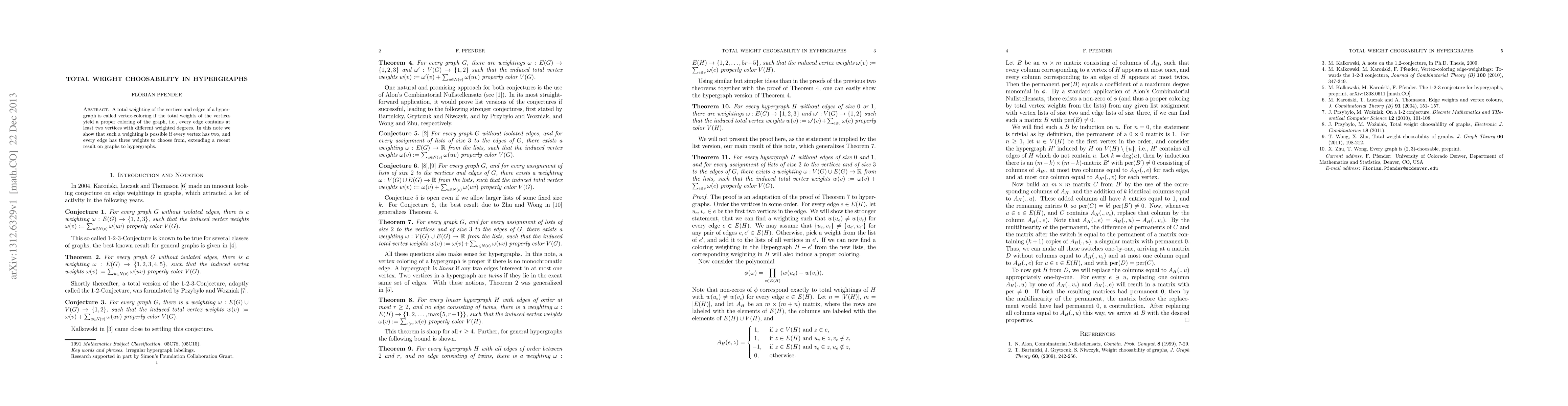 A total weighting of the vertices and edges of a hypergraph is called vertex-coloring if the total weights of the vertices yield a proper coloring of the graph, i.e., every edge contains at least two vertices with different weighted degrees. In this note we show that such a weighting is possible if every vertex has two, and every edge has three weights to choose from, extending a recent result on graphs to hypergraphs.