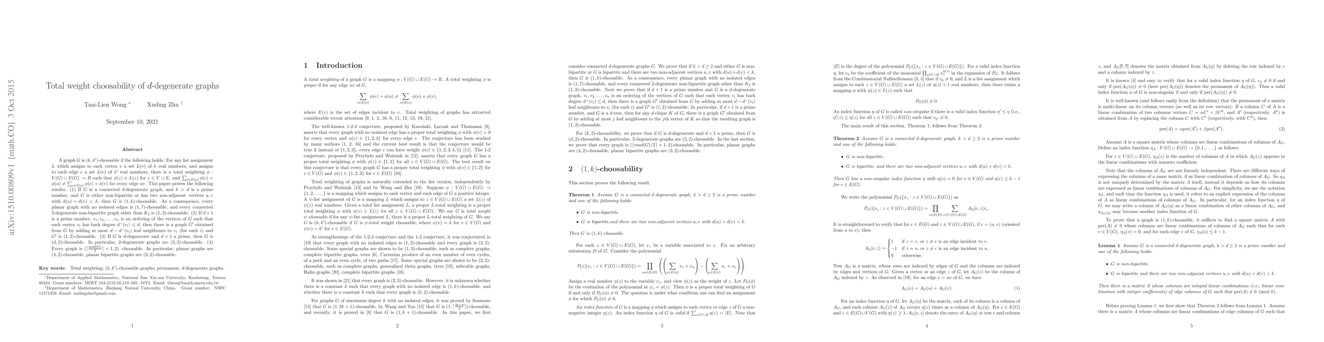 A graph $G$ is $(k,k')$-choosable if the following holds: For any list assignment $L$ which assigns to each vertex $v$ a set $L(v)$ of $k$ real numbers, and assigns to each edge $e$ a set $L(e)$ of $k'$ real numbers, there is a total weighting $\phi: V(G) \cup E(G) \to R$ such that $\phi(z) \in L(z)$ for $z \in V \cup E$, and $\sum_{e \in E(u)}\phi(e)+\phi(u) \ne \sum_{e \in E(v)}\phi(e)+\phi(v)$ for every edge $uv$. This paper proves the following results: (1) If $G$ is a connected $d$-degenerate graph, and $k>d$ is a prime number, and $G$ is either non-bipartite or has two non-adjacent vertices $u,v$ with $d(u)+d(v) < k$, then $G$ is $(1,k)$-choosable. As a consequence, every planar graph with no isolated edges is $(1,7)$-choosable, and every connected $2$-degenerate non-bipartite graph other than $K_2$ is $(1,3)$-choosable. (2) If $d+1$ is a prime number, $v_1, v_2, \ldots, v_n$ is an ordering of the vertices of $G$ such that each vertex $v_i$ has back degree $d^-(v_i) \le d$, then there is a graph $G'$ obtained from $G$ by adding at most $d-d^-(v_i)$ leaf neighbours to $v_i$ (for each $i$) and $G'$ is $(1,2)$-choosable. (3) If $G$ is $d$-degenerate and $d+1$ a prime, then $G$ is $(d,2)$-choosable. In particular, $2$-degenerate graphs are $(2,2)$-choosable. (4) Every graph is $(\lceil\frac{{\rm mad}(G)}{2}\rceil+1, 2)$ -choosable. In particular, planar graphs are $(4,2)$-choosable, planar bipartite graphs are $(3,2)$-choosable.