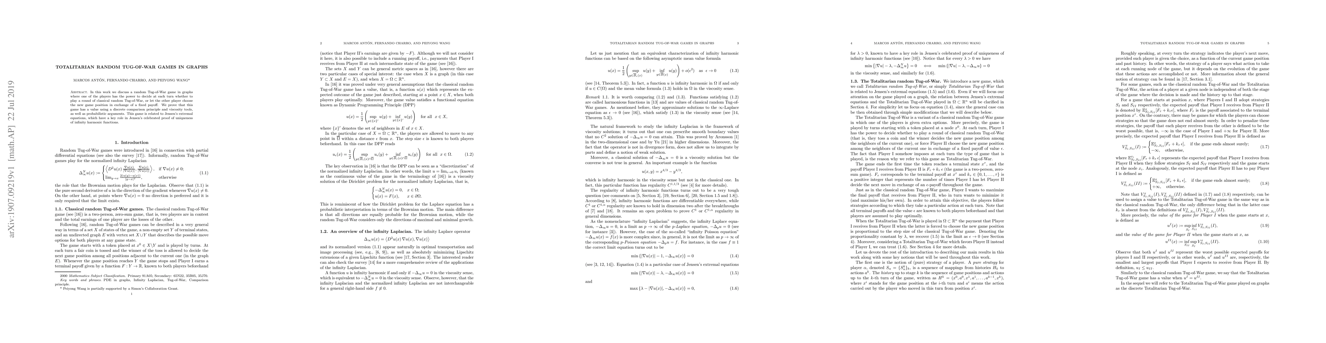 This paper explores a random Tug-of-War game in graphs where one player has unilateral control over game rounds, introducing a strategic element. The authors prove the game's value using discrete comparison principles and viscosity tools, linking it to Jensen's extremal equations and the uniqueness of infinity harmonic functions.
