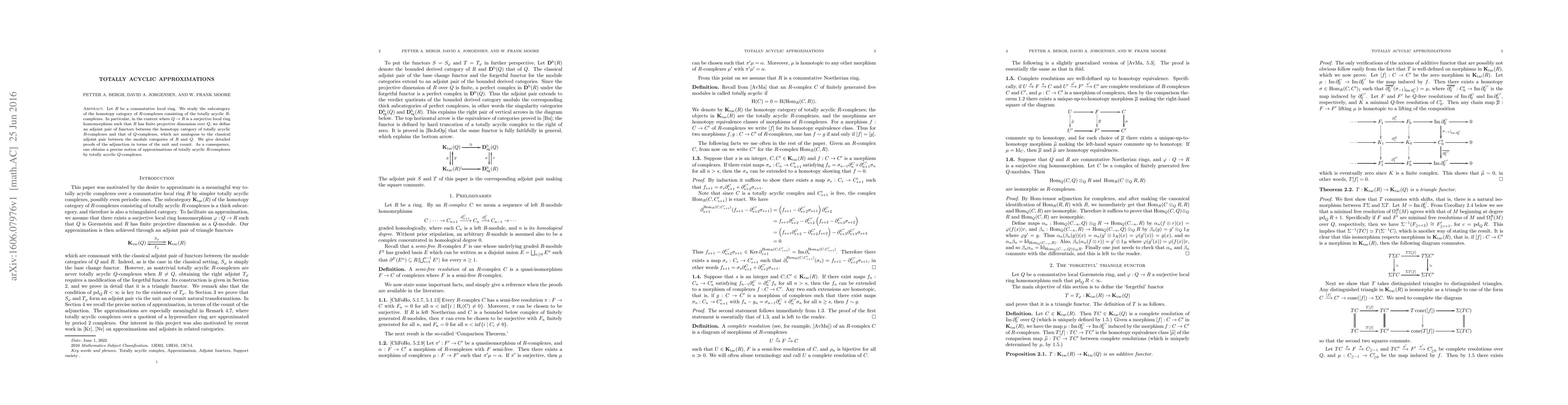 This paper studies the subcategory of totally acyclic $R$-complexes in the homotopy category of $R$-complexes for a commutative local ring $R$. It defines an adjoint pair of functors between these complexes and those of a related ring $Q$, providing detailed proofs and showing how these functors approximate totally acyclic $R$-complexes with $Q$-complexes.