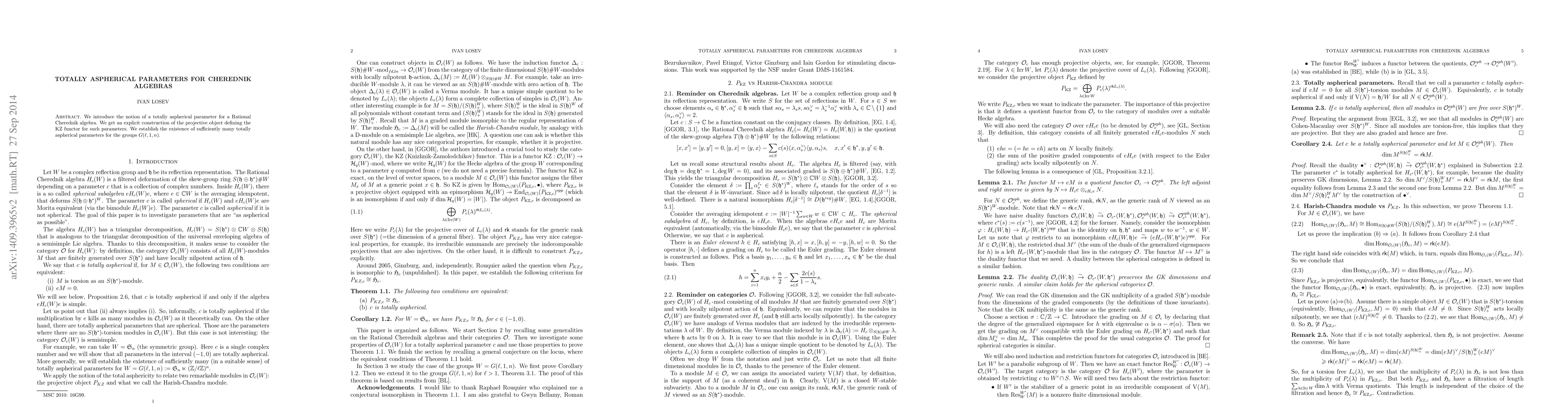 We introduce the notion of a totally aspherical parameter for a Rational Cherednik algebra. We get an explicit construction of the projective object defining the KZ functor for such parameters. We establish the existence of sufficiently many totally aspherical parameters for the groups G(l,1,n).