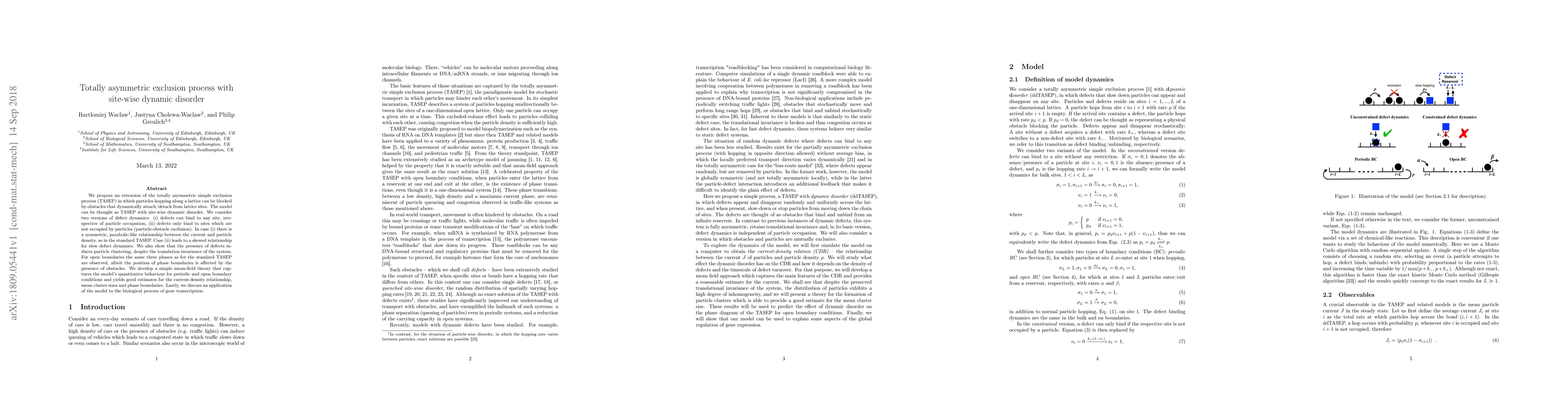We propose an extension of the totally asymmetric simple exclusion process (TASEP) in which particles hopping along a lattice can be blocked by obstacles that dynamically attach/detach from lattice sites. The model can be thought as TASEP with site-wise dynamic disorder. We consider two versions of defect dynamics: (i) defects can bind to any site, irrespective of particle occupation, (ii) defects only bind to sites which are not occupied by particles (particle-obstacle exclusion). In case (i) there is a symmetric, parabolic-like relationship between the current and particle density, as in the standard TASEP. Case (ii) leads to a skewed relationship for slow defect dynamics. We also show that the presence of defects induces particle clustering, despite the translation invariance of the system. For open boundaries the same three phases as for the standard TASEP are observed, albeit the position of phase boundaries is affected by the presence of obstacles. We develop a simple mean-field theory that captures the model's quantitative behaviour for periodic and open boundary conditions and yields good estimates for the current-density relationship, mean cluster sizes and phase boundaries. Lastly, we discuss an application of the model to the biological process of gene transcription.