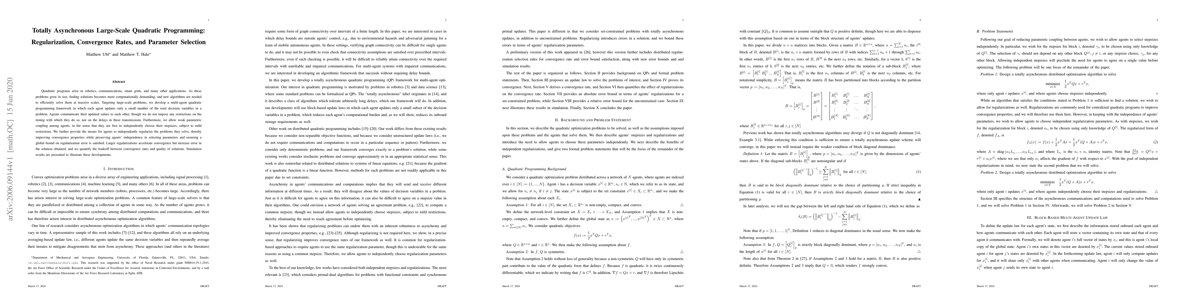 Quadratic programs arise in robotics, communications, smart grids, and many other applications. As these problems grow in size, finding solutions becomes more computationally demanding, and new algorithms are needed to efficiently solve them at massive scales. Targeting large-scale problems, we develop a multi-agent quadratic programming framework in which each agent updates only a small number of the total decision variables in a problem. Agents communicate their updated values to each other, though we do not impose any restrictions on the timing with which they do so, nor on the delays in these transmissions. Furthermore, we allow weak parametric coupling among agents, in the sense that they are free to independently choose their step sizes, subject to mild restrictions. We further provide the means for agents to independently regularize the problems they solve, thereby improving convergence properties while preserving agents' independence in selecting parameters and ensuring a global bound on regularization error is satisfied. Larger regularizations accelerate convergence but increase error in the solution obtained, and we quantify the trade off between convergence rates and quality of solutions. Simulation results are presented to illustrate these developments.