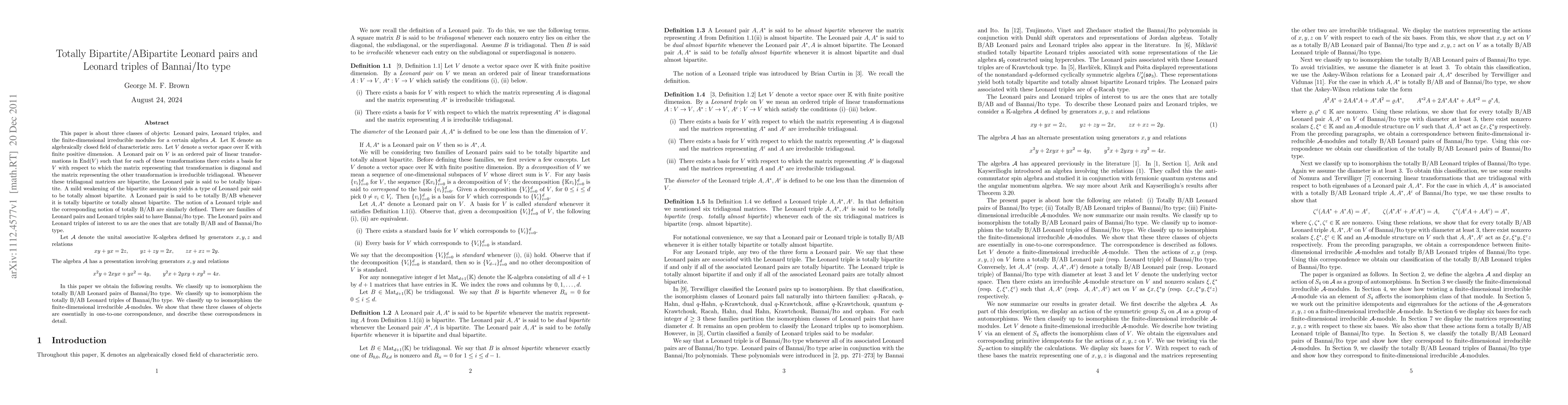 This paper is about three classes of objects: Leonard pairs, Leonard triples, and the finite-dimensional irreducible modules for an algebra $\mathcal{A}$. Let $\K$ denote an algebraically closed field of characteristic zero. Let $V$ denote a vector space over $\K$ with finite positive dimension. A Leonard pair on $V$ is an ordered pair of linear transformations in End$(V)$ such that for each of these transformations there exists a basis for $V$ with respect to which the matrix representing that transformation is diagonal and the matrix representing the other transformation is irreducible tridiagonal. Whenever the tridiagonal matrices are bipartite, the Leonard pair is said to be totally bipartite. A mild weakening yields a type of Leonard pair said to be totally almost bipartite. A Leonard pair is said to be totally B/AB whenever it is totally bipartite or totally almost bipartite. The notion of a Leonard triple and the corresponding notion of totally B/AB are similarly defined. There are families of Leonard pairs and Leonard triples said to have Bannai/Ito type. The Leonard pairs and Leonard triples of interest to us are totally B/AB and of Bannai/Ito type. Let $\mathcal{A}$ denote the unital associative $\K$-algebra defined by generators $x,y,z$ and relations\[xy+yx=2z,\qquad yz+zy=2x,\qquad zx+xz=2y.\]The algebra $\mathcal{A}$ has a presentation involving generators $x,y$ and relations\[x^{2}y+2xyx+yx^{2}=4y,\qquad y^{2}x+2yxy+xy^{2}=4x.\] In this paper we obtain the following results. We classify up to isomorphism the totally B/AB Leonard pairs of Bannai/Ito type. We classify up to isomorphism the totally B/AB Leonard triples of Bannai/Ito type. We classify up to isomorphism the finite-dimensional irreducible $\mathcal{A}$-modules. We show that these three classes of objects are essentially in one-to-one correspondence, and describe these correspondences in detail.