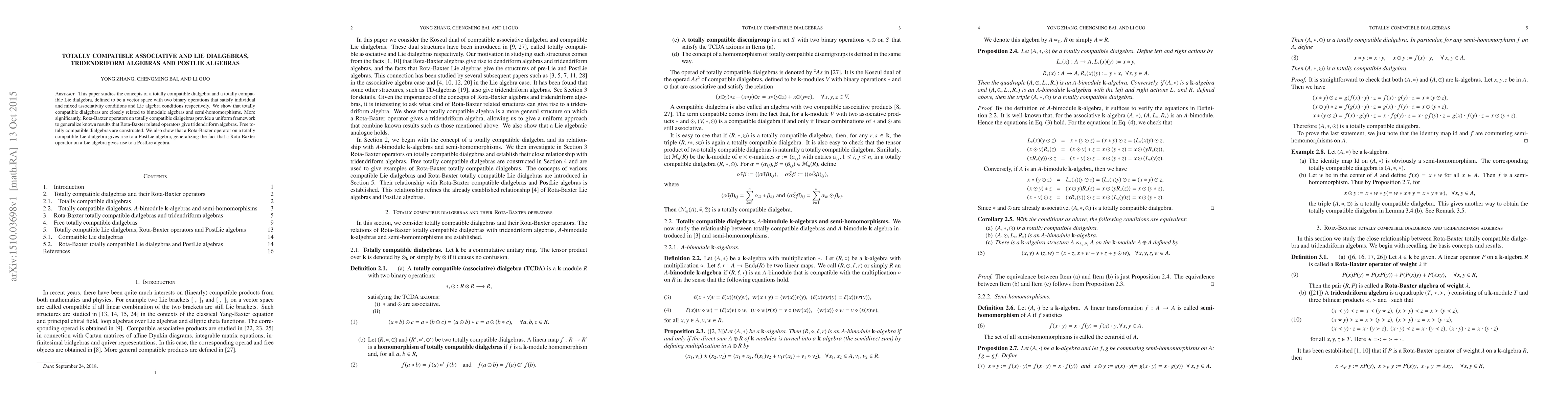 This paper studies the concepts of a totally compatible dialgebra and a totally compatible Lie dialgebra, defined to be a vector space with two binary operations that satisfy individual and mixed associativity conditions and Lie algebra conditions respectively. We show that totally compatible dialgebras are closely related to bimodule algebras and semi-homomorphisms. More significantly, Rota-Baxter operators on totally compatible dialgebras provide a uniform framework to generalize known results that Rota-Baxter related operators give tridendriform algebras. Free totally compatible dialgebras are constructed. We also show that a Rota-Baxter operator on a totally compatible Lie dialgebra gives rise to a PostLie algebra, generalizing the fact that a Rota-Baxter operator on a Lie algebra gives rise to a PostLie algebra.