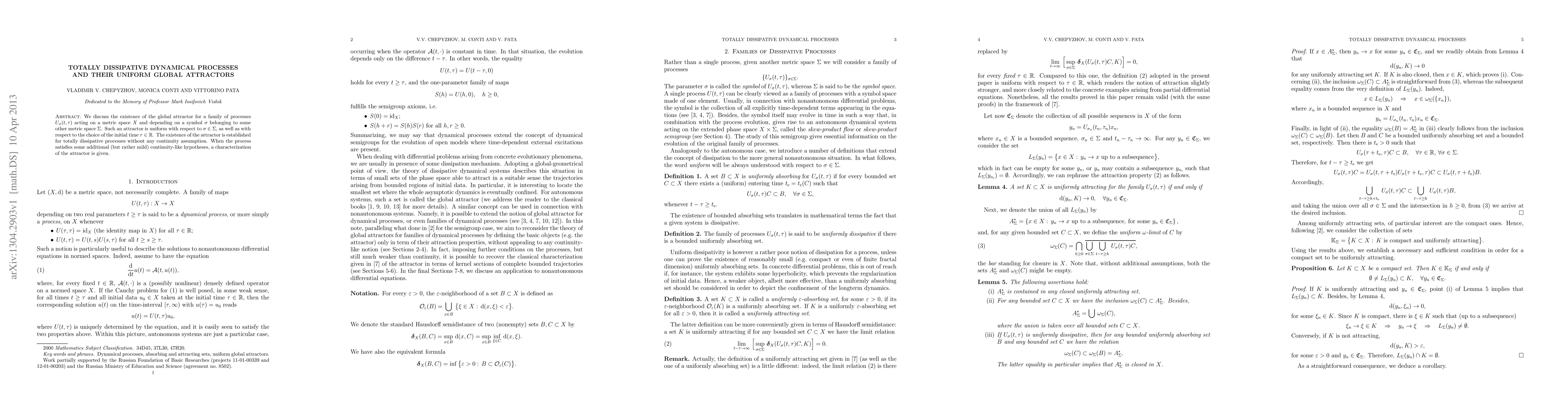 A research paper discusses the existence of global attractors for totally dissipative dynamical processes without continuity assumptions, with implications for uniform attractors in metric spaces.