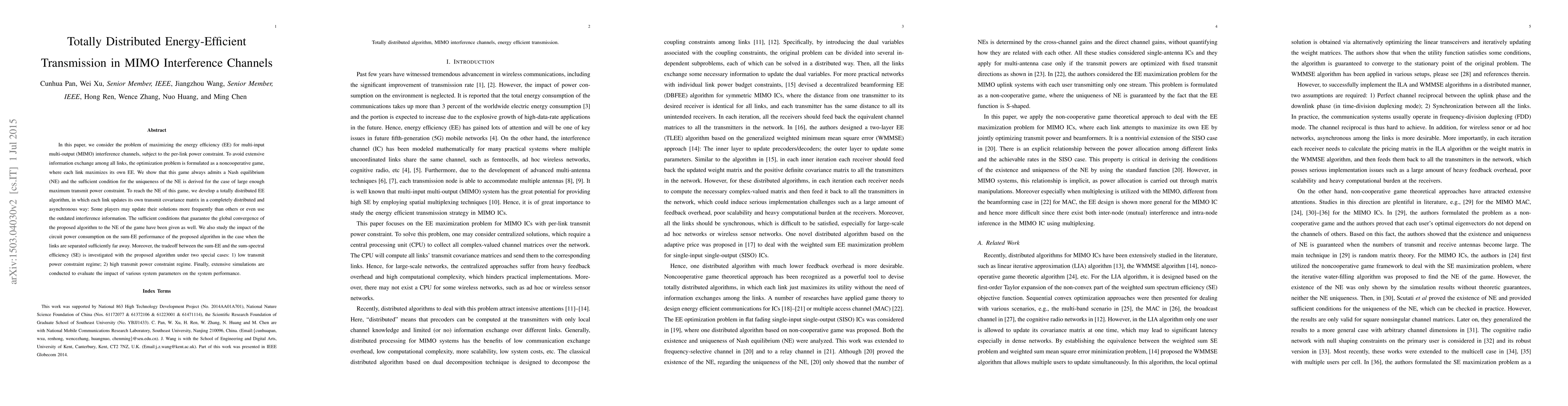 This paper proposes a noncooperative game framework to maximize energy efficiency in MIMO interference channels, developing a totally distributed algorithm that ensures convergence to a Nash equilibrium without extensive information exchange. The study also examines the impact of circuit power and the tradeoff between energy and spectral efficiency.